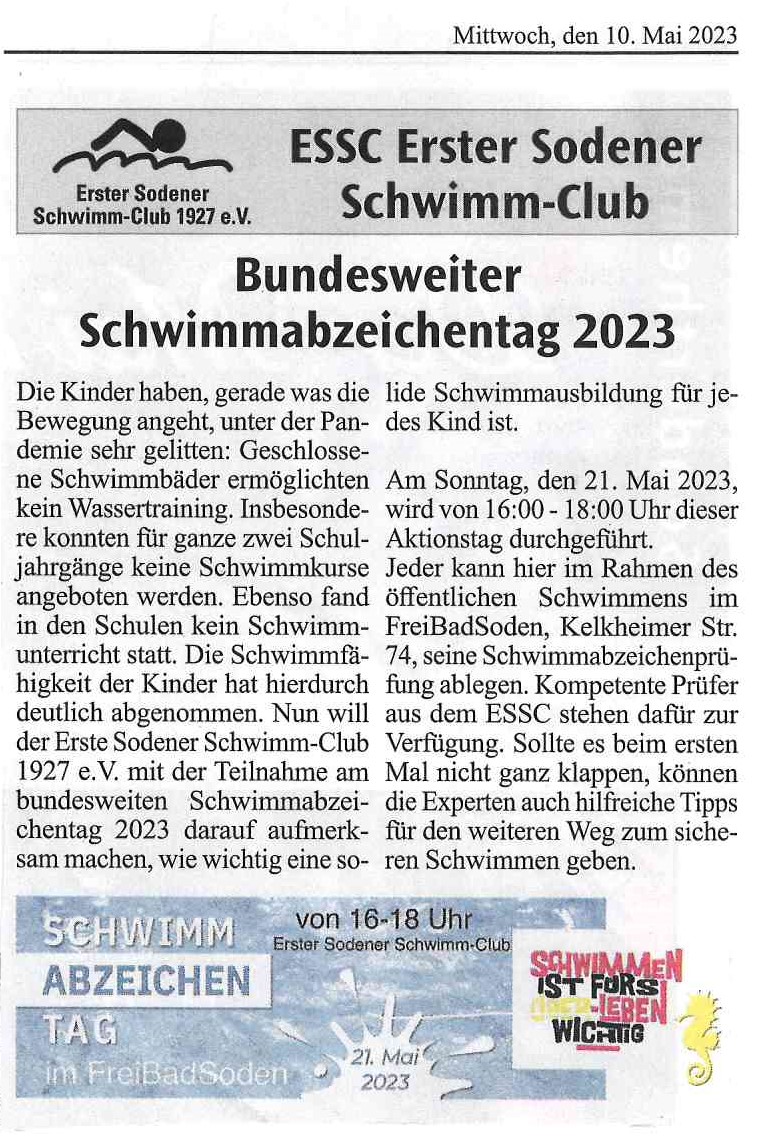 Der ESSC nahm am 21.05.2023 am bundesweiten Schwimmabzeichentag teil. Das Motto dieses Tages: Schwimmen ist fürs Überleben wichtig! In zwei Stunden konnten im FreiBadSoden 23 Abnahmen von