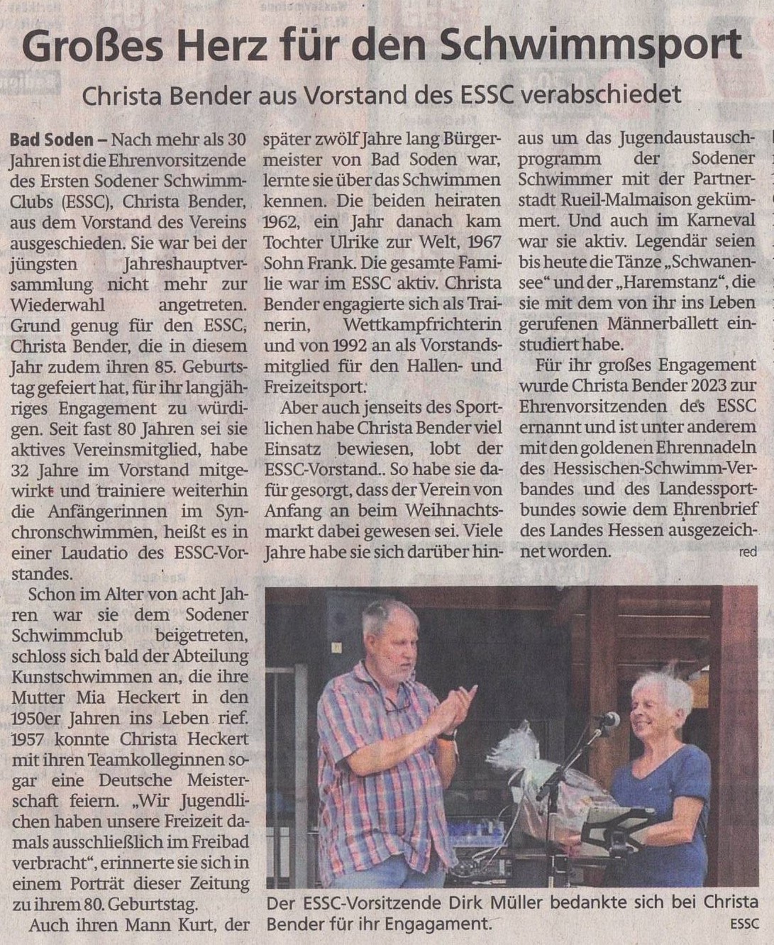 Christa Bender kam im Alter von vier Jahren mit ihren Eltern aus Bad Kreuznach nach Bad Soden. Von ihrem Vater Hans, der damals schon ein sehr guter Turmspringer war, erbte sie die Liebe zum Wassersport. Mit acht Jahren wurde sie Mitglied im ESSC und ist ihrem Verein bis heute treu geblieben.