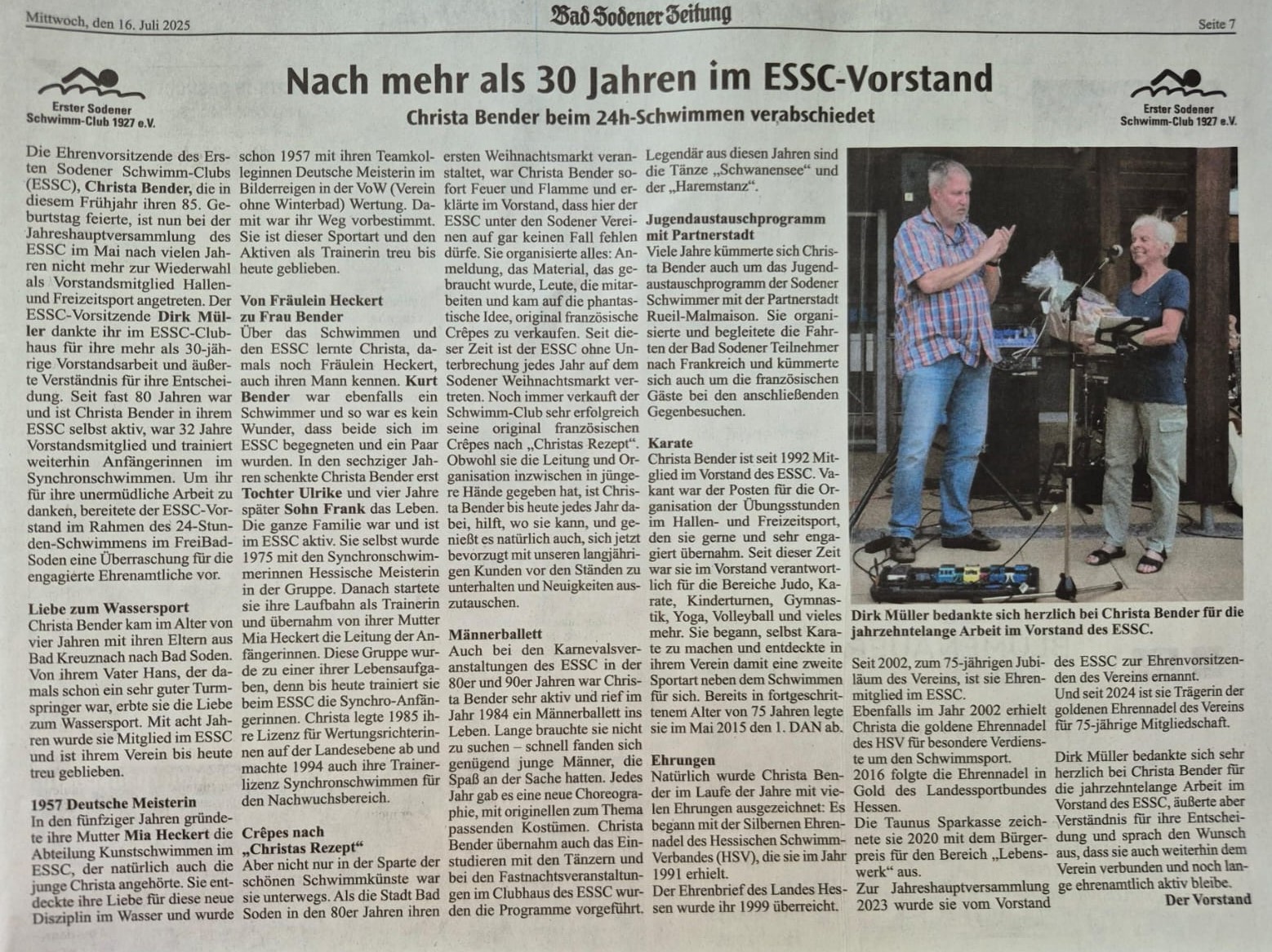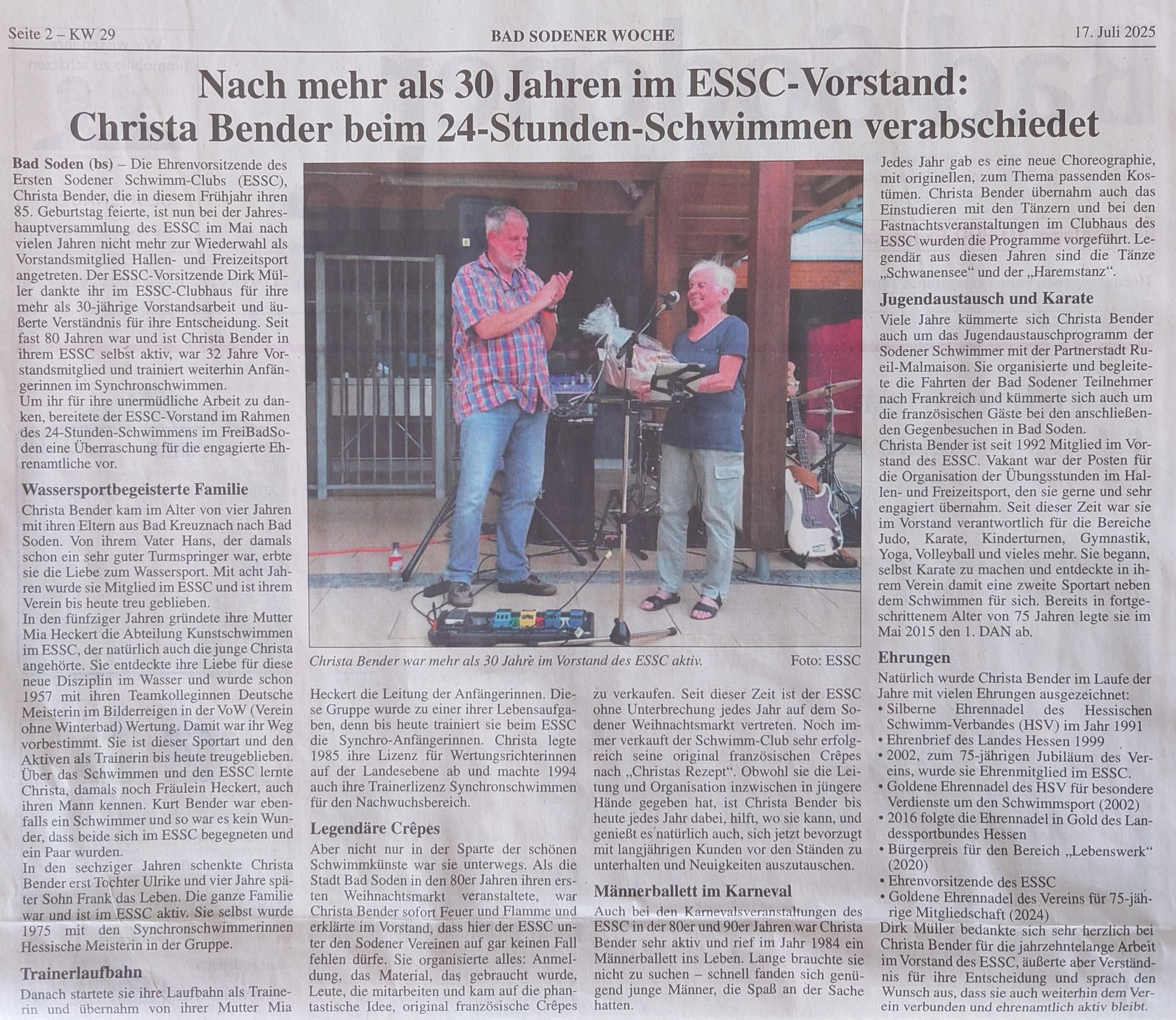 Seit fast 80 Jahren war und ist Christa Bender in ihrem ESSC selbst aktiv, war 32 Jahre Vorstandsmitglied und trainiert weiterhin Anfängerinnen im Synchronschwimmen. Um ihr für ihre unermüdliche