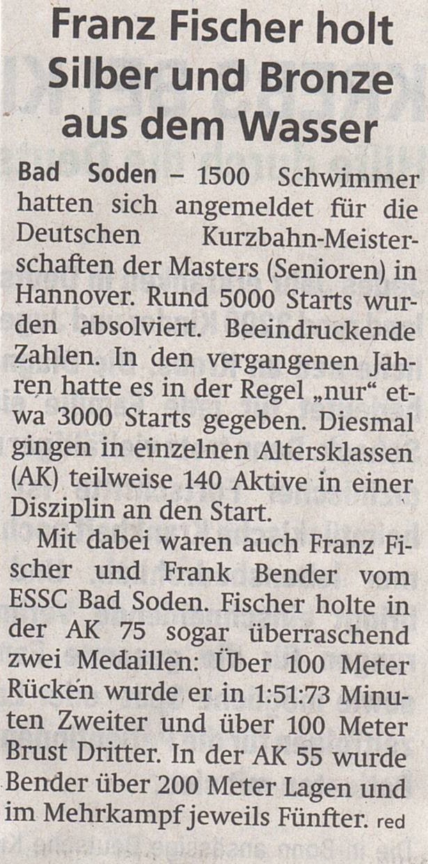 Mit Franz Fischer und Frank Bender gingen zwei Aktive für den ESSC bei den stark besetzten Deutschen Kurzbahnmeisterschaften der Master in Hannover an den Start. Nach Meldeschluss war der Ausrichter von den hohen Meldezahlen überrascht und musste kurzfristig die Anfangszeiten vorlegen und bat die Vereine auch, die Meldungen zu reduzieren. Trotzdem schafften es die SGS Hannover der Ausrichter, diese Veranstaltung perfekt durchzuführen. 1500 Teilnehmer aus ganz Deutschland gaben mehr als 5000 Meldungen ab. In den vergangenen Jahren sind es üblicherweise ca. 3000 Starts. So gingen in einzelnen Altersklassen teilweise 140 Aktive in einer Disziplin an den Start.
