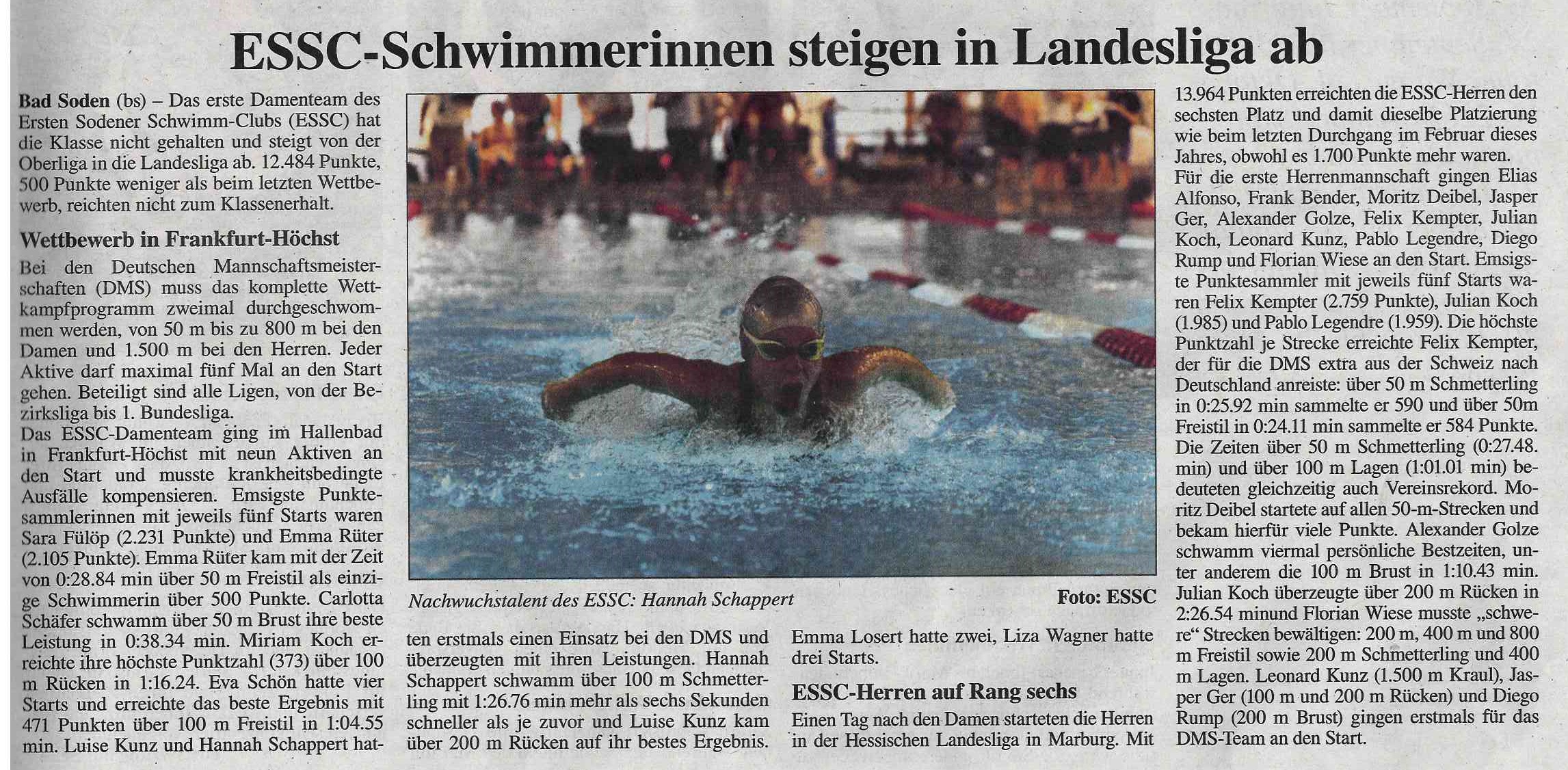 Die höchste Punktzahl je Strecke erreichte Felix Kempter, der für die DMS extra aus der Schweiz nach Deutschland anreiste: über 50m Schmetterling in 0:25.92 min. 590 P. und 50m Freistil in 0:24.11 min. 584 P. Die Zeiten in 50m Schmetterling sowie 50m Rücken (0:27.48. min.) und 100m Lagen (1:01.01 min.) bedeuteten gleichzeitig auch Vereinsrekord. Moritz Deibel startete in allen 50m Strecken und bekam hierfür viele Punkte. Alexander Golze schwamm viermal persönliche Bestzeiten, u.a. die 100m Brust in 1:10.43 min. Julian Koch überzeugte über 200m Rücken in 2:26.54 min. und Florian Wiese musste mit „schweren“ Strecken bewältigen (200m, 400m und 800m Freistil sowie 200m Schmetterling und 400m Lagen). Leonard Kunz (1500m Kraul), Jasper Ger (100m und 200m Rücken) und Diego Rump (200m Brust) gingen erstmals für das DMS-Team an den Start.