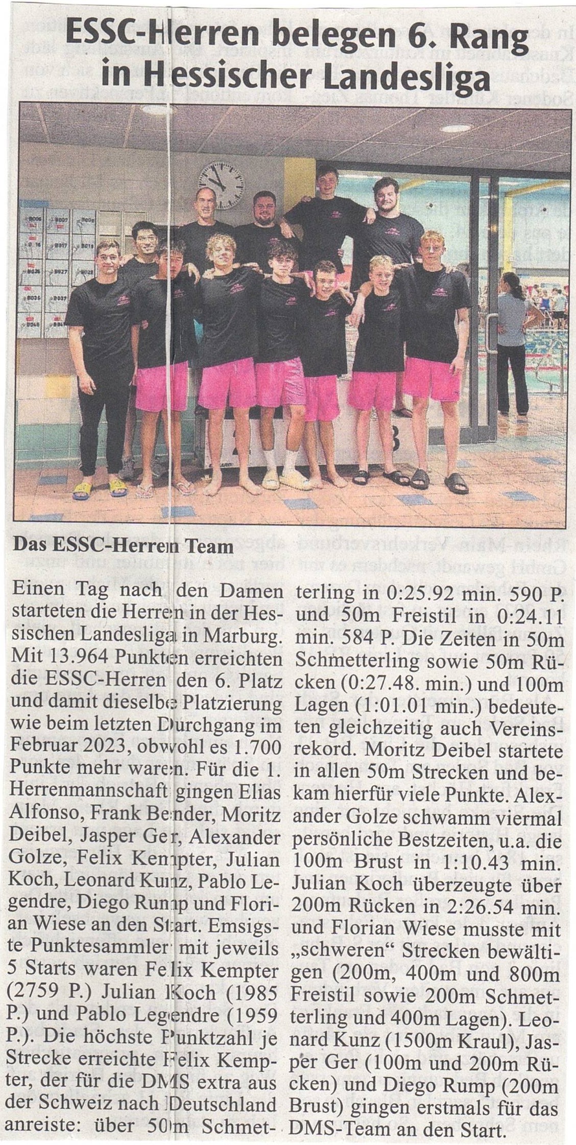 Einen Tag nach den Damen starteten die Herren in der Hessischen Landesliga in Marburg. Mit 13.964 Punkten erreichten die ESSC-Herren den 6. Platz und damit dieselbe Platzierung wie beim letzten DMS-Durchgang im Februar dieses Jahres, obwohl es 1.700 Punkte mehr waren.