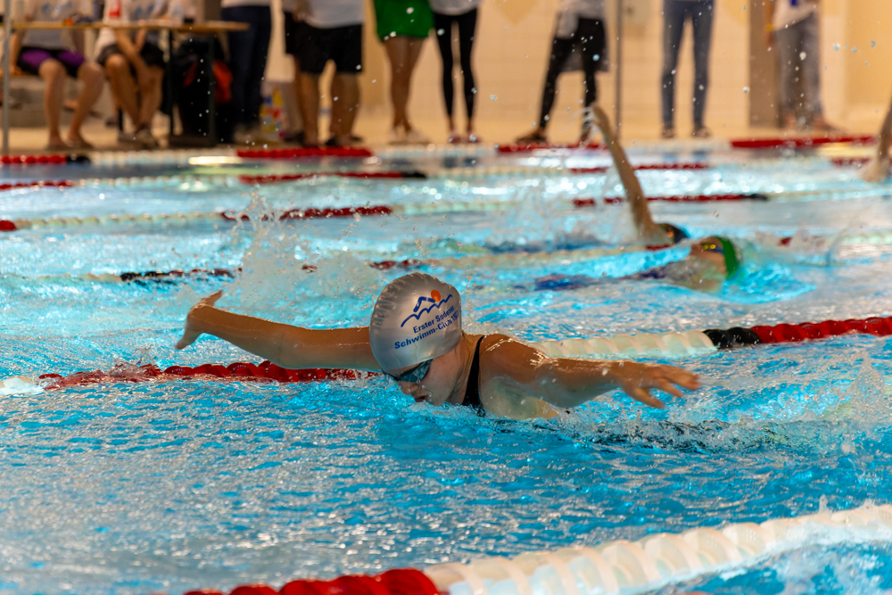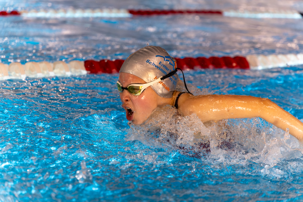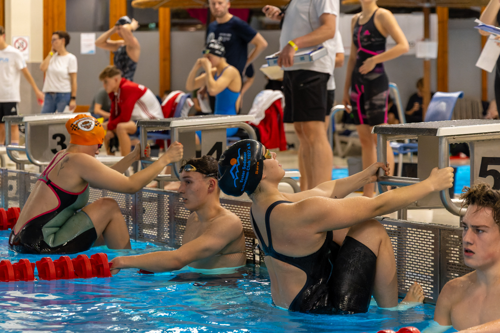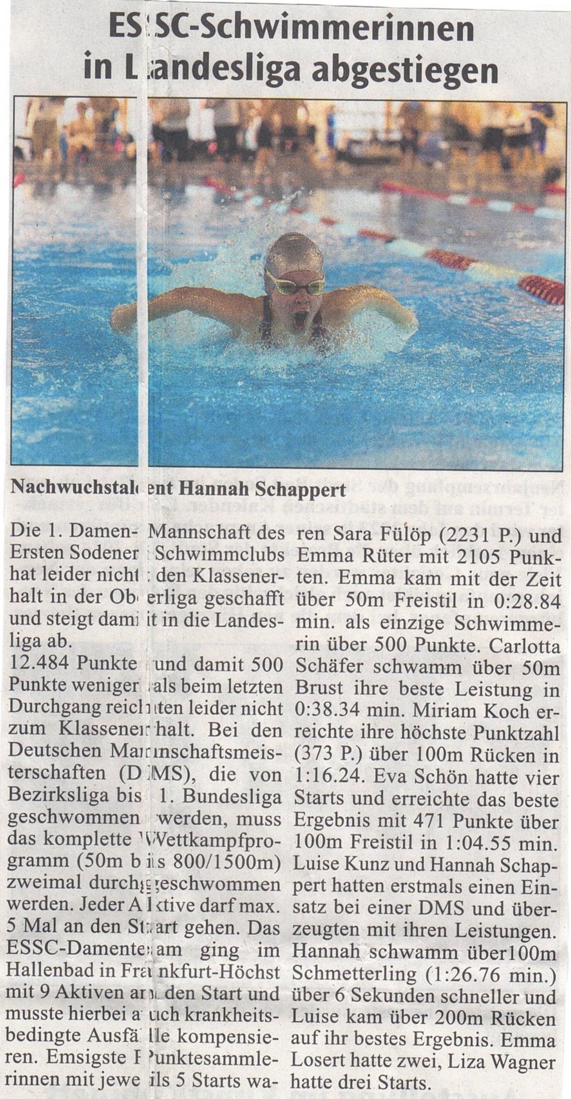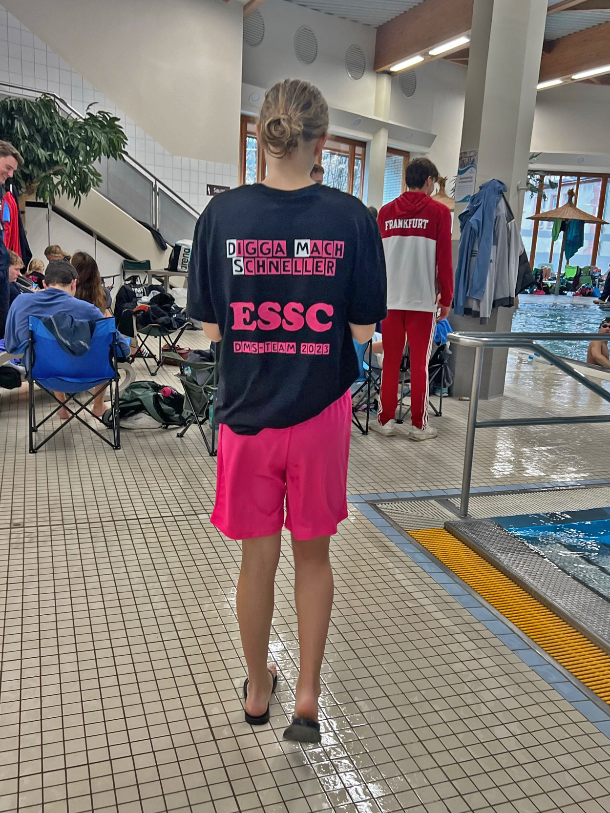 12.484 Punkten und damit 500 Punkte weniger als beim letzten Durchgang reichten leider nicht zum Klassenerhalt. Bei der Deutschen Mannschafts-meisterschaften (DMS), die von Bezirksliga bis 1. Bundesliga geschwommen werden, muss das komplette Wettkampfprogramm (50m bis 800/1500m) zweimal durchgeschwommen werden. Jeder Aktive darf max. 5mal an den Start gehen. Das ESSC-Damenteam ging im Hallenbad in Frankfurt-Höchst mit 9 Aktiven an den Start und musste hierbei auch krankheitsbedingte Ausfälle kompensieren.