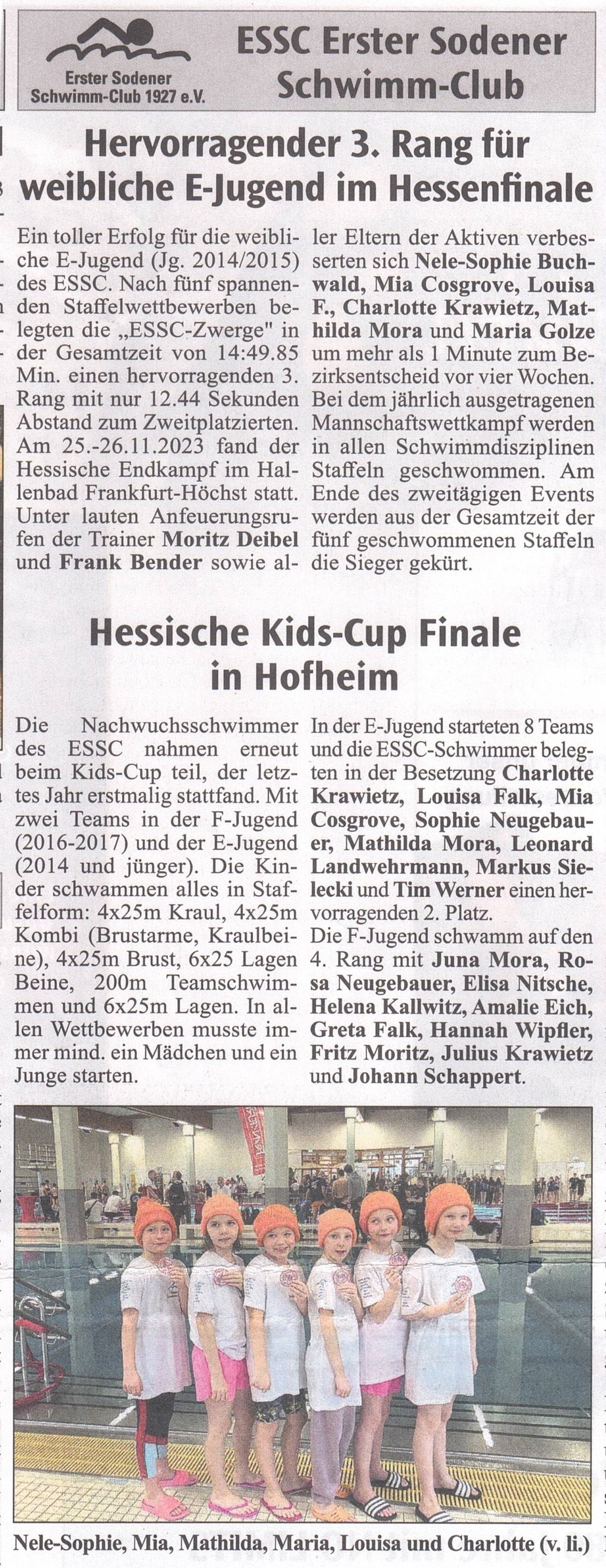 Am 25.-26.11.2023 fand der Hessische Endkampf im Hallenbad Frankfurt-Höchst statt. Unter lauten Anfeuerungsrufen der Trainer Moritz Deibel und Frank Bender sowie aller Eltern der Aktiven verbesserten sich Nele-Sophie Buchwald, Mia Cosgrove, Louisa F., Charlotte Krawietz, Mathilda Mora und Maria Golze um mehr als 1 Min. zum Bezirksentscheid vor vier Wochen.