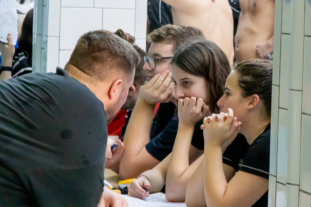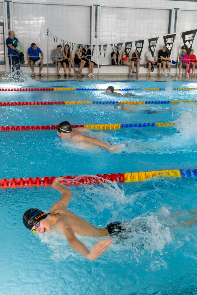 Am Sonntag waren dann die Nachwuchsschwimmer*innen der Jahrgänge 2010 und jünger gefragt. Die Halle war deutlich voller und der Wettkampftag mit 1400 Starts lang. Einige der insgesamt 36 jungen ESSCler*innen gaben am Sonntag ihr Wettkampfdebüt (Nele-Sophie Buchwald, Maxi Buschmann, Yoana Filcheva, Charlotte Krawietz, David Legien, Sophia Neugebauer, Thiago Rump und Lea Schabel).