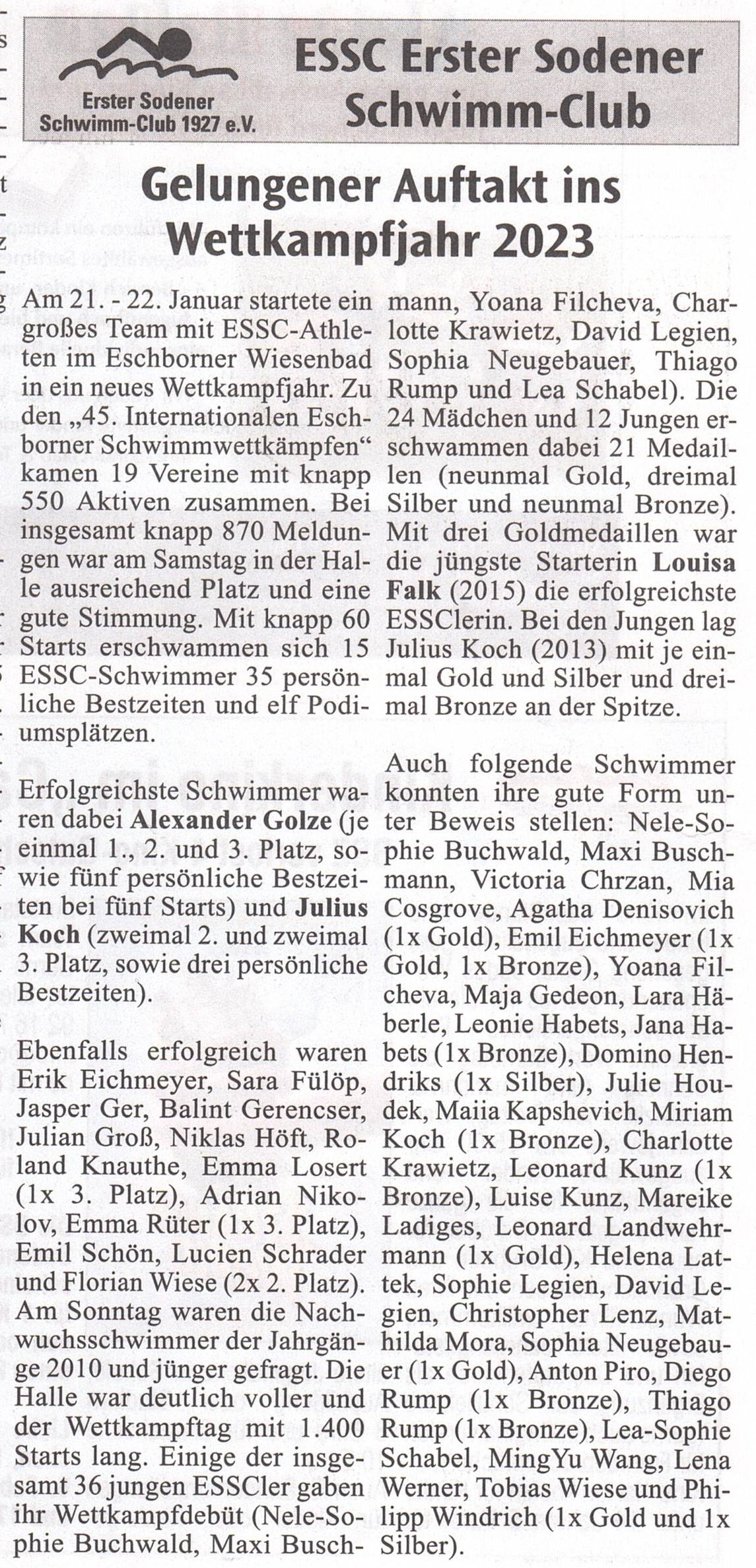 Am 21.- 22. Januar startete ein großes Team von Athlet*innen des ESSC im Eschborner Wiesenbad in ein neues Wettkampfjahr. Der Start ist wirklich gelungen! Zu den 45. Internationalen Eschborner Schwimmwettkämpfen kamen 19 Vereine mit knapp 550 Aktiven zusammen.