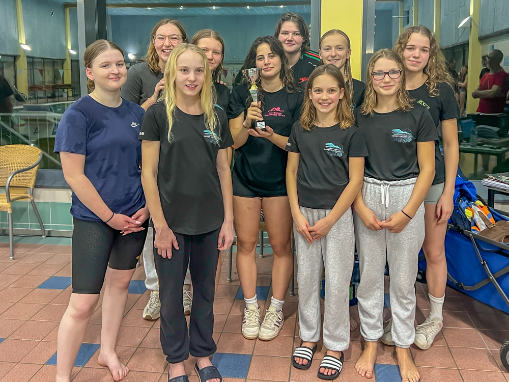 Victoria Chew, Sara Fülöp, Luise Kunz, Helena Lattek, Emilia Muth, Emma Rüter, Carlotta Schäfer, Hannah Schappert, Eva Schön und Liza Wagner gingen bei den Frauen an den Start. Ebenso wie bei den Männern musste Trainer Lukas Müller kurzfristig auf krankheitsbedingte Ausfälle reagieren und umstellen. So kamen auch drei Nachwuchsschwimmerinnen (Luise Kunz, Helena Lattek und Hannah Schappert) teils zu ihrem ersten Einsatz bei der DMS. Die meisten Punkte steuerte Emma Rüter mit 2.501 Punkten bei, während Sara Fülöp die punktbeste Leistung über 50m Schmetterling mit 534 Punkten zeigte. Zudem stellte sie über 50m und 100m Schmetterling zwei neue Vereinsrekorde auf. Eine wahnsinnig starke Teamleistung. Mit 15 persönlichen Bestzeiten und einem Endstand von 14.102 Punkten katapultierte sich die Mannschaft auf Platz drei der Landesliga und schaffte damit den Aufstieg in die Hessische Oberliga.