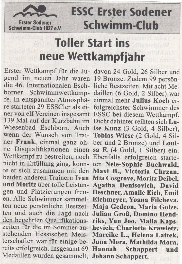 Am 20. und 21. Januar standen die 46. Internationalen Eschborner Schwimmwettkämpfe im Kalender. In entspannter Atmosphäre starteten 29 ESSCler*innen als einer von elf Vereinen insgesamt 139mal auf der Kurzbahn im Wiesenbad Eschborn. Auch wenn der Wunsch von Trainer Frank, einmal ganz ohne Disqualifikationen einen Wettkampf zu bestreiten, noch nicht in Erfüllung ging, konnte er sich zusammen mit den beiden anderen Trainern Ivan und Moritz über tolle Leistungen und Platzierungen freuen.