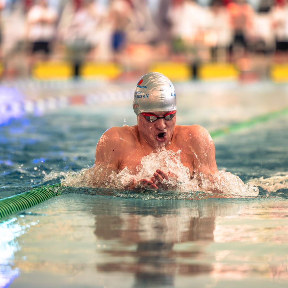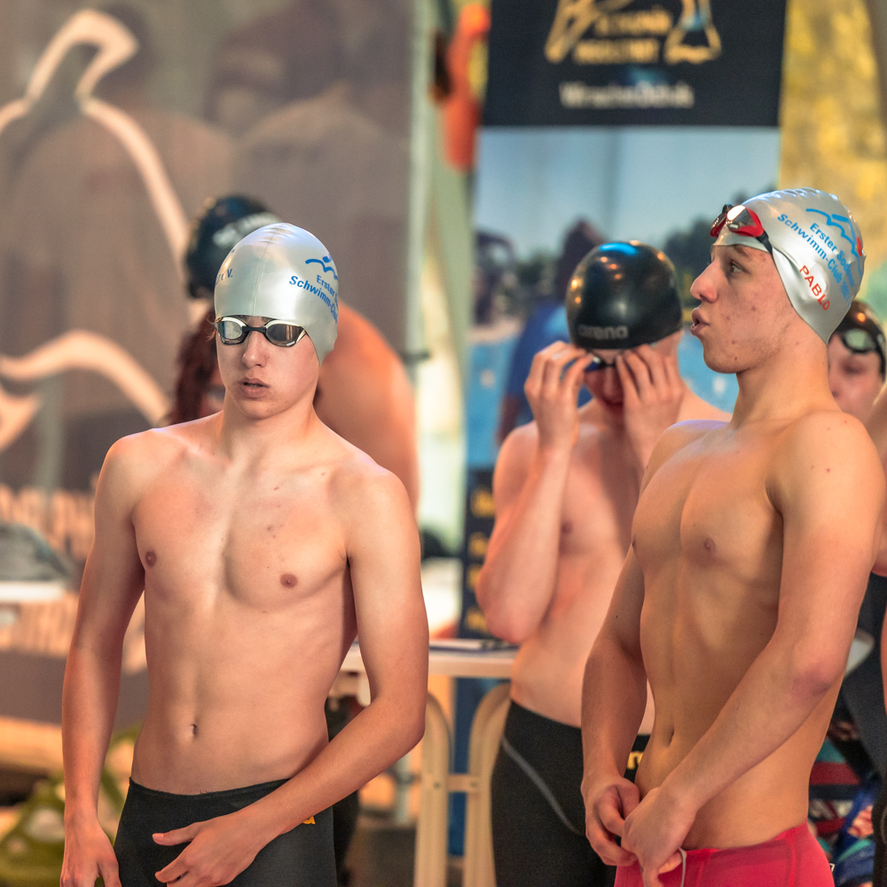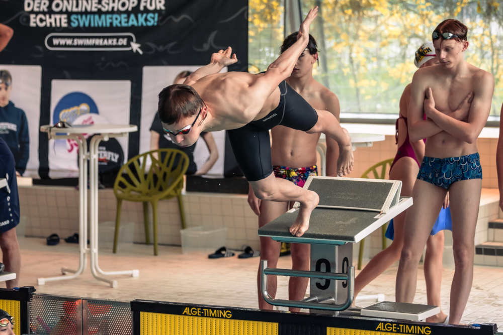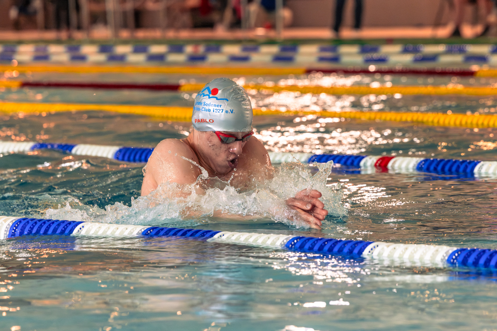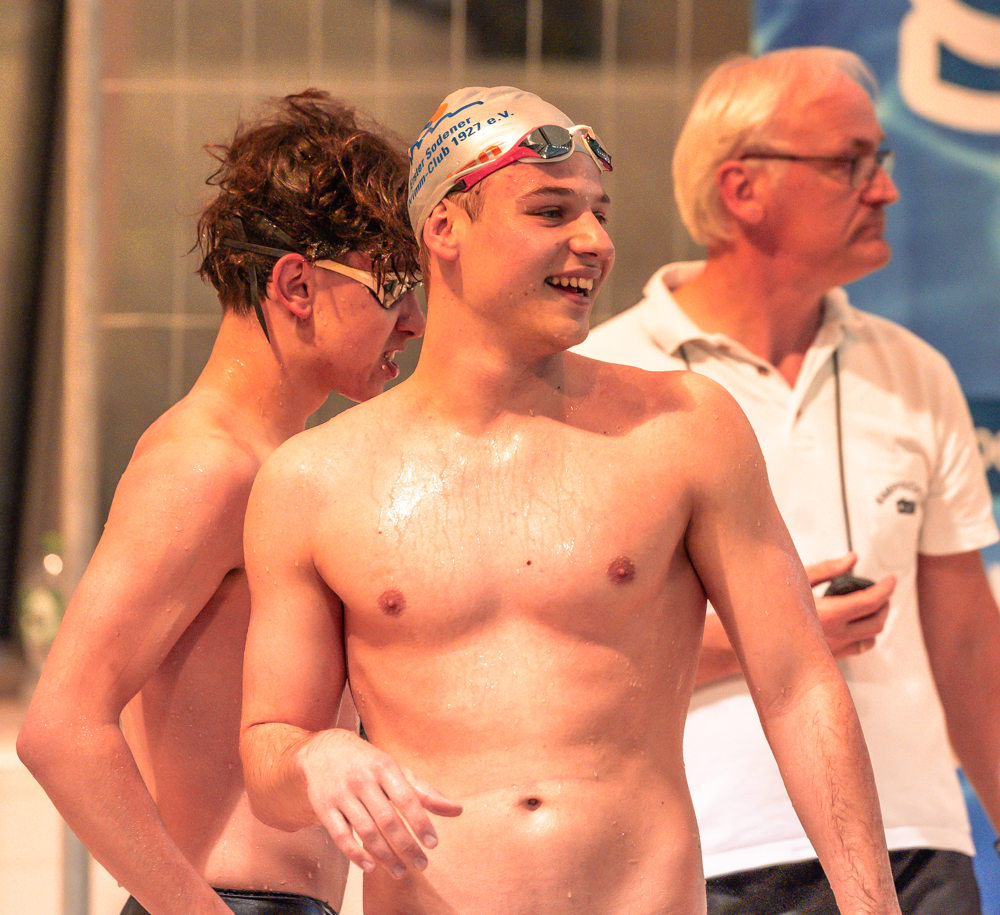 Nachdem es am Samstag dann direkt mit der nächsten Staffel weiterging (Leif, Emma, Sara und Hadrien über 4x100m Freistil), folgten für Emma Rüter, Diego Rump, Alexander Golze und Pablo Legendre der Einzelstart über 50m Brust. Einige von ihnen hatten hier neben einer guten Platzierung auch die Hoffnung auf eine Qualifikation zu den DJM Ende Mai im Hinterkopf. Diego, Alex und Pablo konnten die Anspannung in Energie umwandeln und schwammen hier fantastische Bestzeiten. Diego verbesserte sich um fast sechs Zehntel und belegte Platz acht. Damit hat er sich auch den Platz bei den Deutschen Jahrgangsmeisterschaften gesichert. Alex verbesserte sich ebenfalls um eine halbe Sekunde und belegte in einem starken Feld Platz 25. Pablo stellte seinen eigenen Vereinsrekord mit über einer Sekunde Bestzeit ein, sicherte sich Platz 5 und wird auf dieser Strecke ebenfalls bei den DJM starten. Emma konnte auf dieser Strecke ihre Leistung nicht verbessern und landete auf dem 13. Platz.