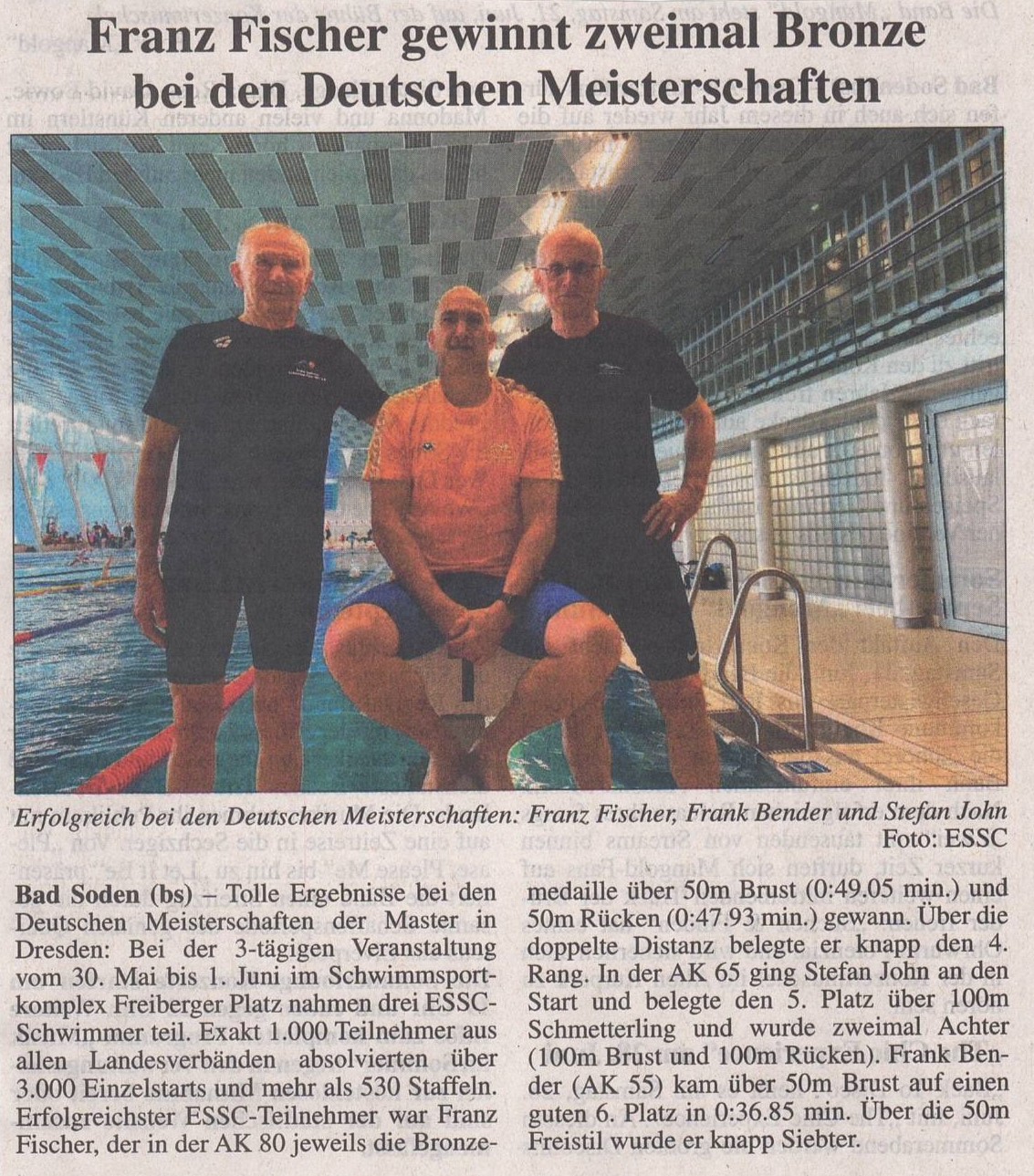 Tolle Ergebnisse bei den Deutschen Meisterschaften der Master in Dresden. Bei der 3-tägigen Veranstaltung vom 30.05. bis 01.06.2025 im Schwimmsportkomplex Freiberger Platz nahmen drei ESSC-Schwimmer teil. Exakt 1000 Teilnehmer aus allen Landesverbänden absolvierten über 3000 Einzelstarts und mehr als 530 Staffeln. Erfolgreichster ESSC-Teilnehmer war Franz Fischer, der in der AK 80 jeweils die Bronzemedaille über 50m Brust (0:49.05 min.) und 50m Rücken (0:47.93 min.) gewann. Über die doppelte Distanz belegte er knapp den 4. Rang. In der AK 65 ging Stefan John an den Start und belegte den 5. Platz über 100m Schmetterling und wurde zweimal Achter (100m Brust und 100m Rücken). Frank Bender (AK 55) kam über 50m Brust auf einen guten 6. Platz in 0:36.85 min. Über die 50m Freistil wurde er knapp Siebter.