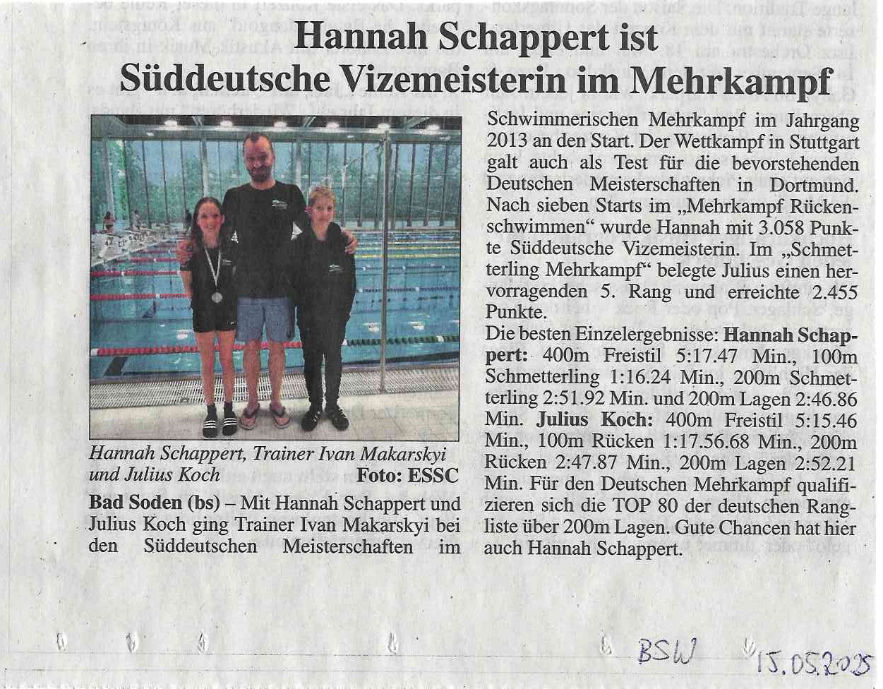 Nach sieben Starts im "Mehrkampf Rücken-schwimmen" wurde Hannah mit 3058 Punkte Süddeutsche Vizemeisterin. Im "Schmetterling Mehrkampf" belegte Julius einen hervorragenden 5. Rang und erreichte 2455 Punkte.