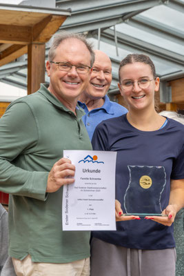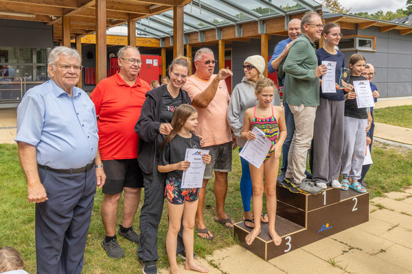 Höhepunkt der Veranstaltung war einmal mehr die Familienstaffel. Seit mehr als 35 Jahren sind die Familienstaffeln schon eine lange Tradition um die schnellste Familie Bad Sodens sowie um die begehrten Geschenkgutscheine. Diese Rennen sind immer eine große Motivation für die Kinder, im Rahmen der Familie für eine Sache zu schwimmen. Es siegte Familie Schramke (1:43.03 Min.), gefolgt von Familie Cosgrove (1:58.27 Min.) und Dritter wurde Familie Werner (2:00.55 Min.). Alle drei Familien platzierten sich erstmals für einen Podestplatz und bekamen auch die „Haifischflosse“ als Glastrophäe.