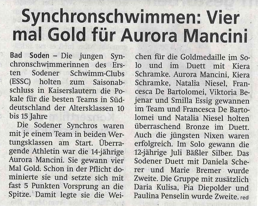 Im Solo gewann die 12-jährige Juli Bäßler die Silbermedaille hinter der Konkurrentin aus Nürnberg und vor der Schwimmerin aus Schwenningen. Das Sodener Duett in dieser Klasse schwammen Daniela Scherer und Marie Bremer und auch sie gewannen Silber hinter dem Paar aus Nürnberg.