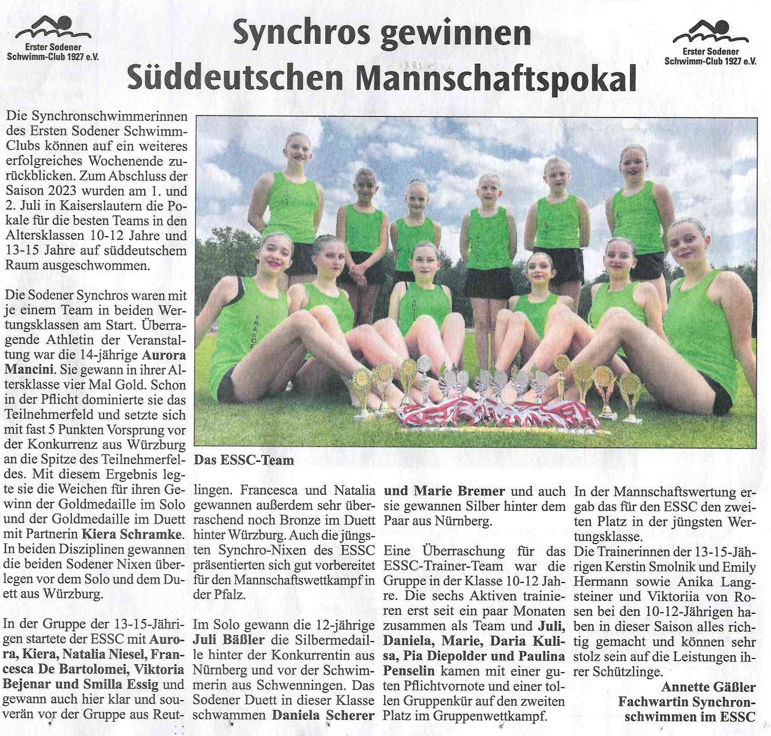 Die Synchronschwimmerinnen des Ersten Sodener Schwimm-Clubs können auf ein weiteres erfolgreiches Wochenende zurückblicken. Zum Abschluss der Saison 2023 wurden am 1. und 2. Juli in Kaiserslautern die Pokale für die besten Teams in den Altersklassen 10-12 Jahre und 13-15 Jahre auf süddeutschem Raum ausgeschwommen.