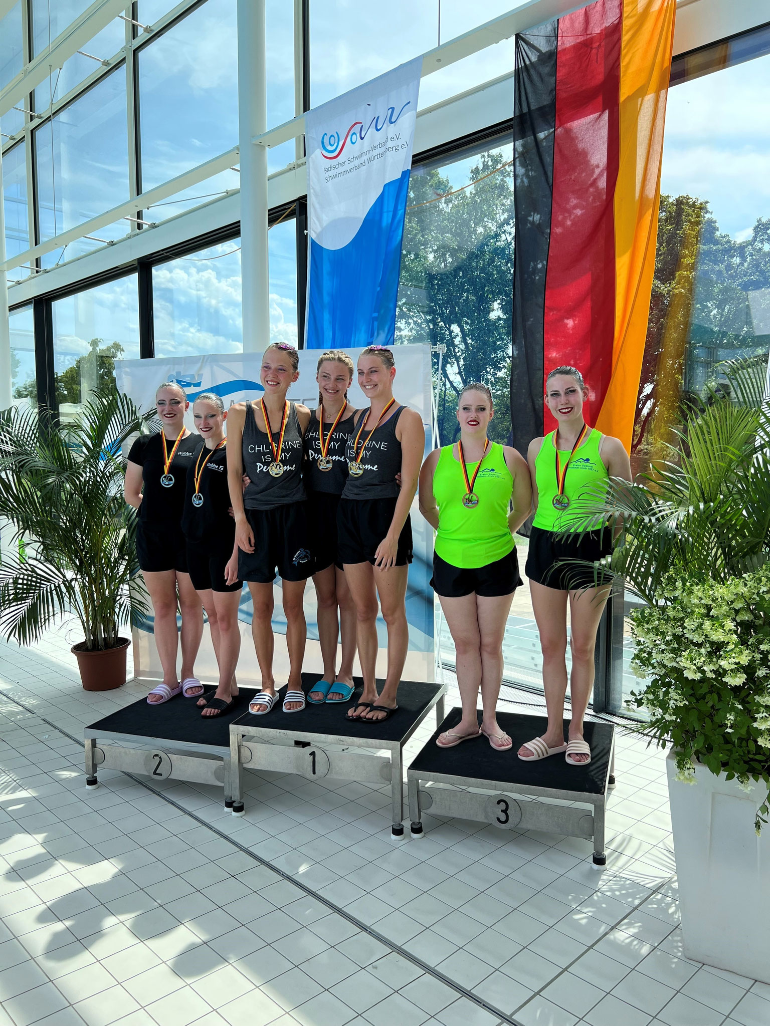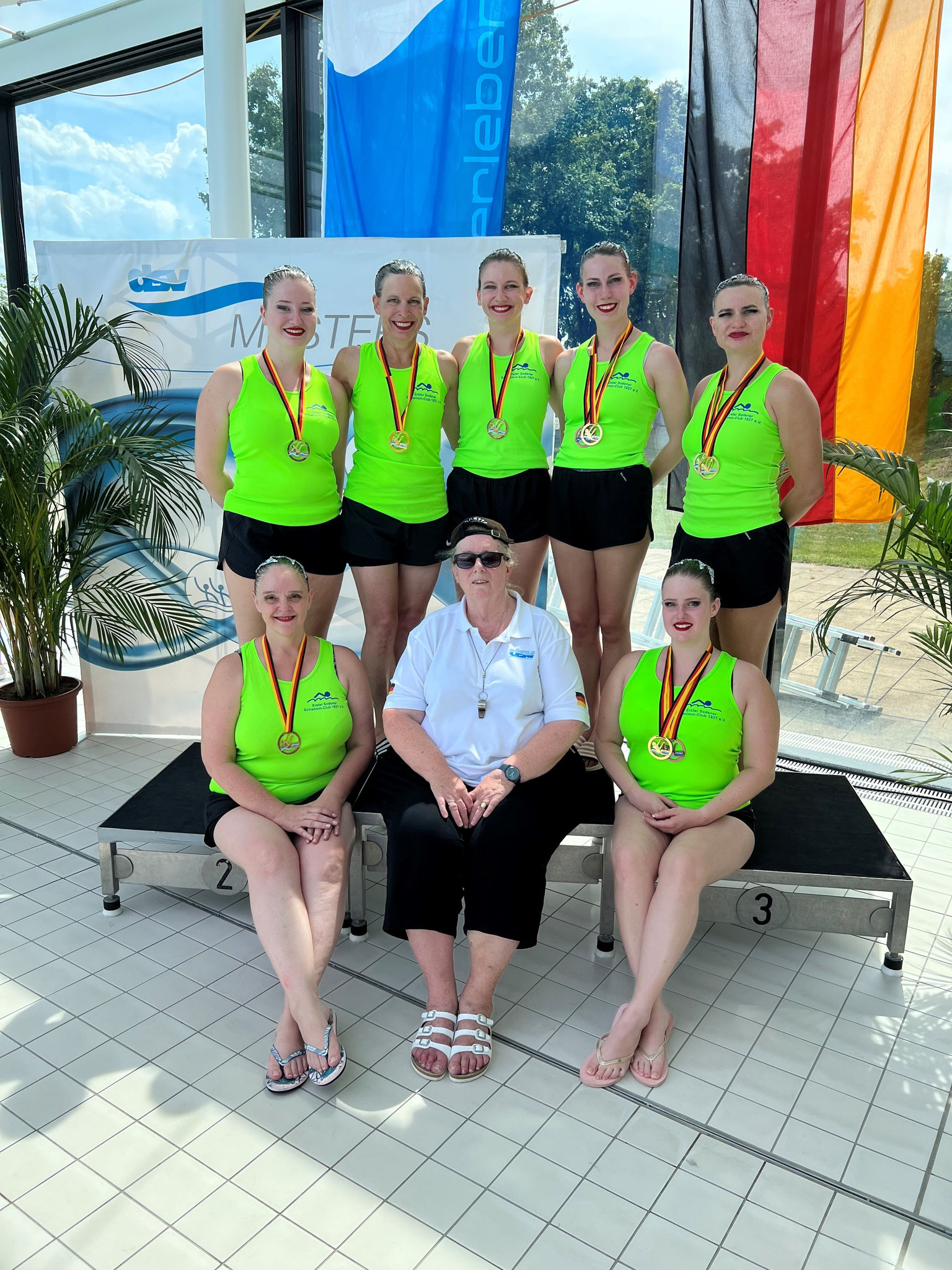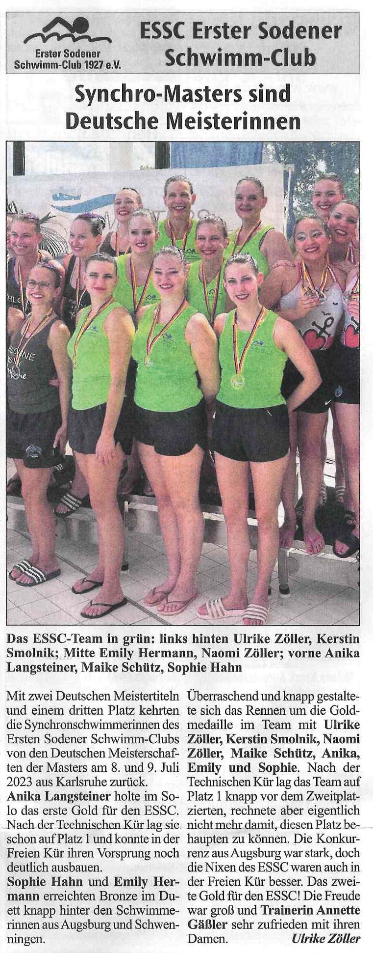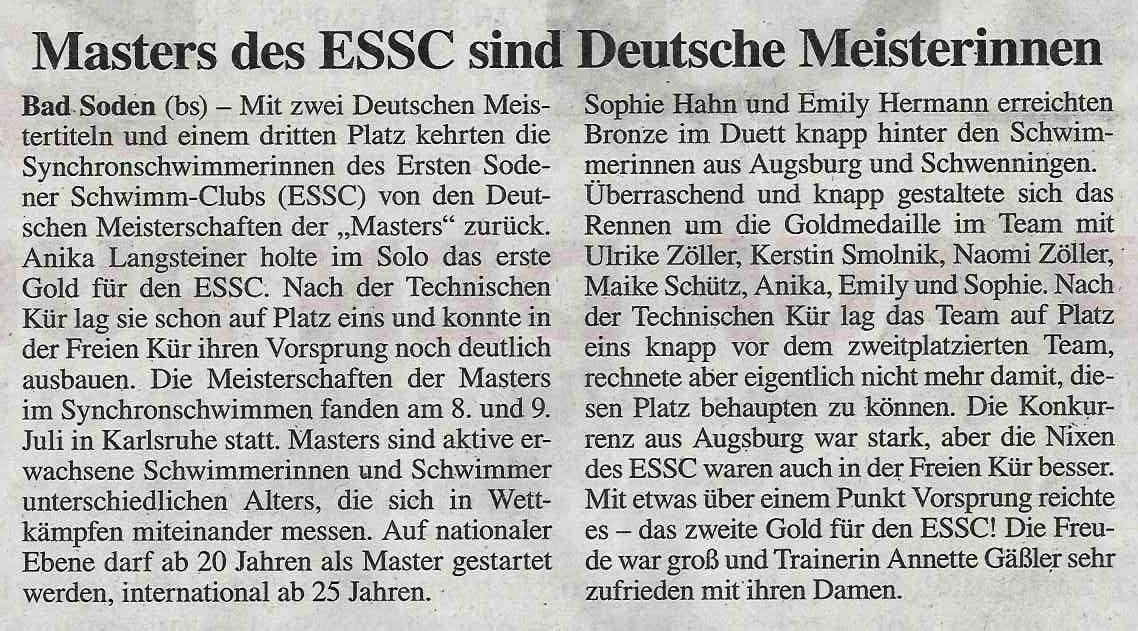 Mit zwei Deutschen Meistertiteln und einem dritten Platz kehrten die Synchronschwimmerinnen des Ersten Sodener Schwimm-Clubs von den Deutschen Meisterschaften der Masters am 8. und 9. Juli 2023 aus Karlsruhe zurück.