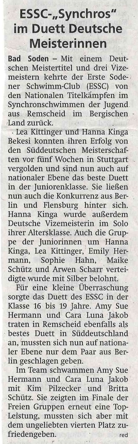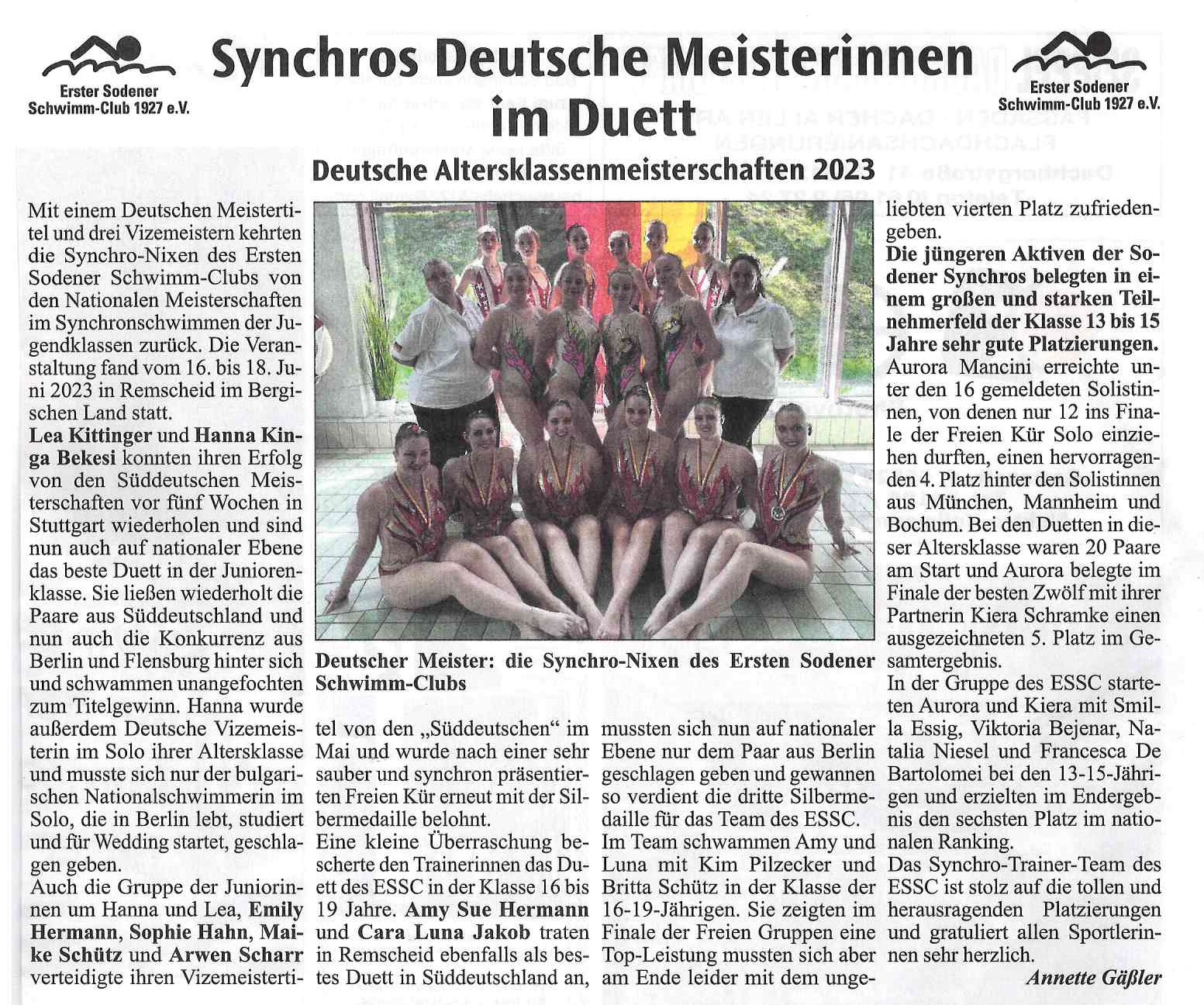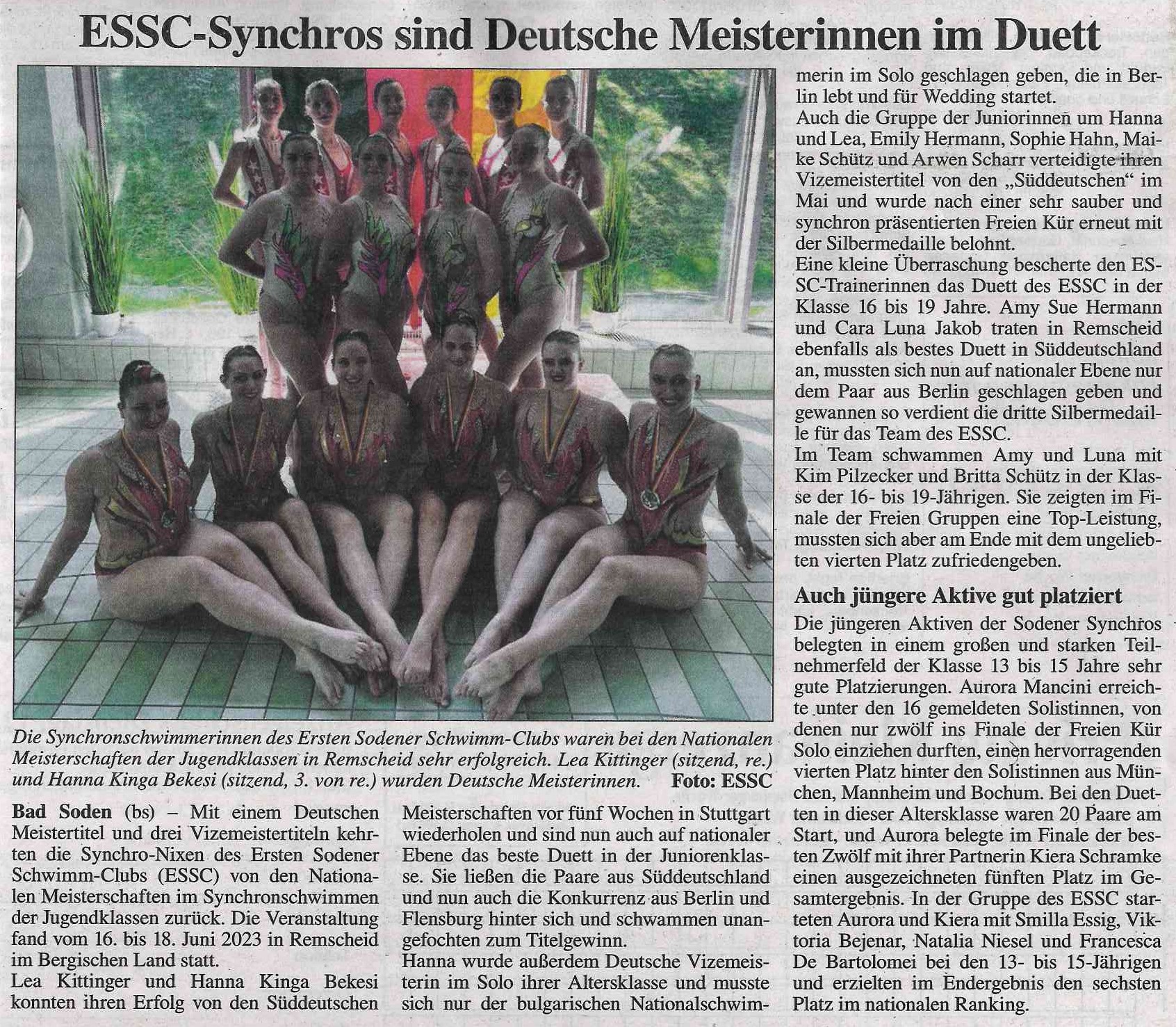 Mit einem Deutschen Meistertitel und drei Vizemeistern kehrten die Synchro-Nixen des Ersten Sodener Schwimm-Clubs von den Nationalen Meisterschaften im Synchronschwimmen der Jugendklassen zurück. Die Veranstaltung fand vom 16. bis 18. Juni 2023 in Remscheid im Bergischen Land statt.