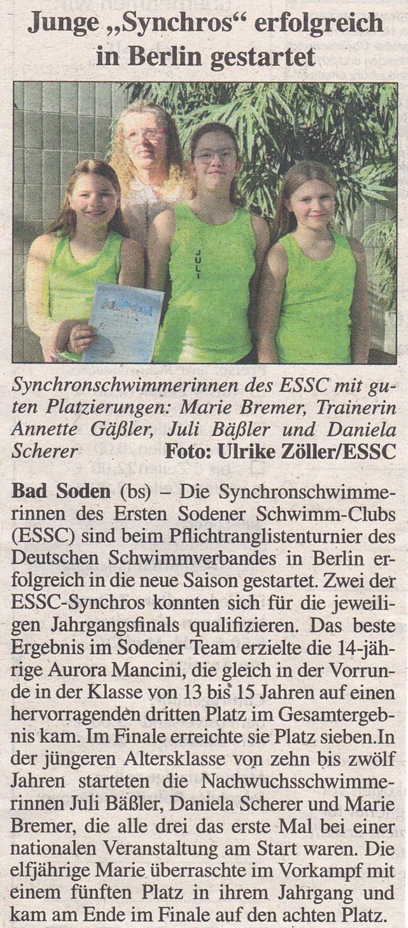 Die Synchronschwimmerinnen des Ersten Sodener Schwimm-Clubs starteten am vergangenen Wochenende in die neue Saison und nahmen am 25./26. Februar 2023 am Pflichtranglistenturnier des Deutschen Schwimmverbandes in Berlin teil.