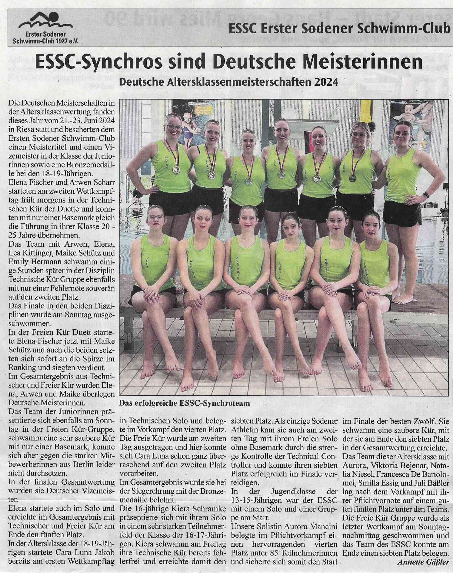 Die Deutschen Meisterschaften in der Altersklassenwertung fanden dieses Jahr vom 21.-23. Juni 2024 in Riesa statt und bescherten dem Ersten Sodener Schwimm-Club einen Meistertitel und einen Vizemeister in der Klasse der Juniorinnen sowie eine Bronzemedaille bei den 18-19-Jährigen.