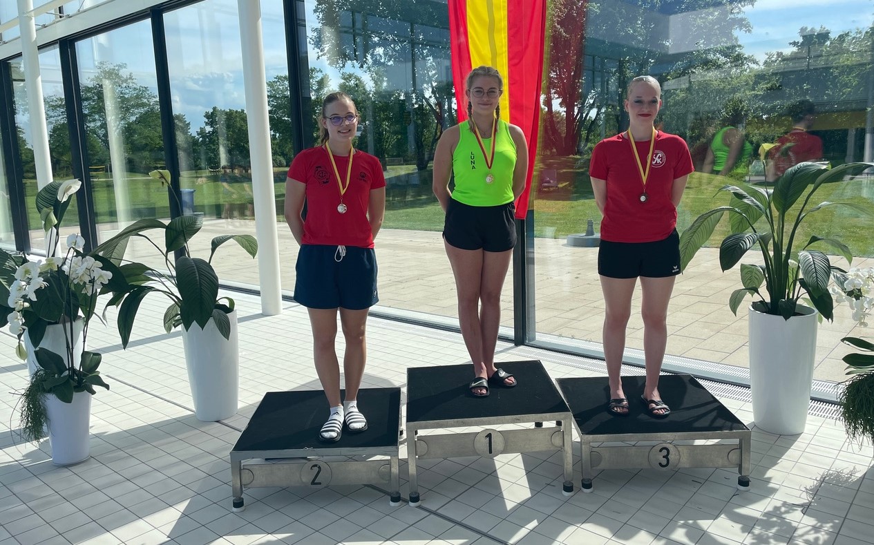 Smilla Essig, Juli Bäßler und Daniela Scherer im Team-Wettkampf über eine Bronzemedaille freuen. Mit nur 2 Fehlerpunkten in der Freien Gruppe lagen sie direkt hinter dem Favoriten aus München und