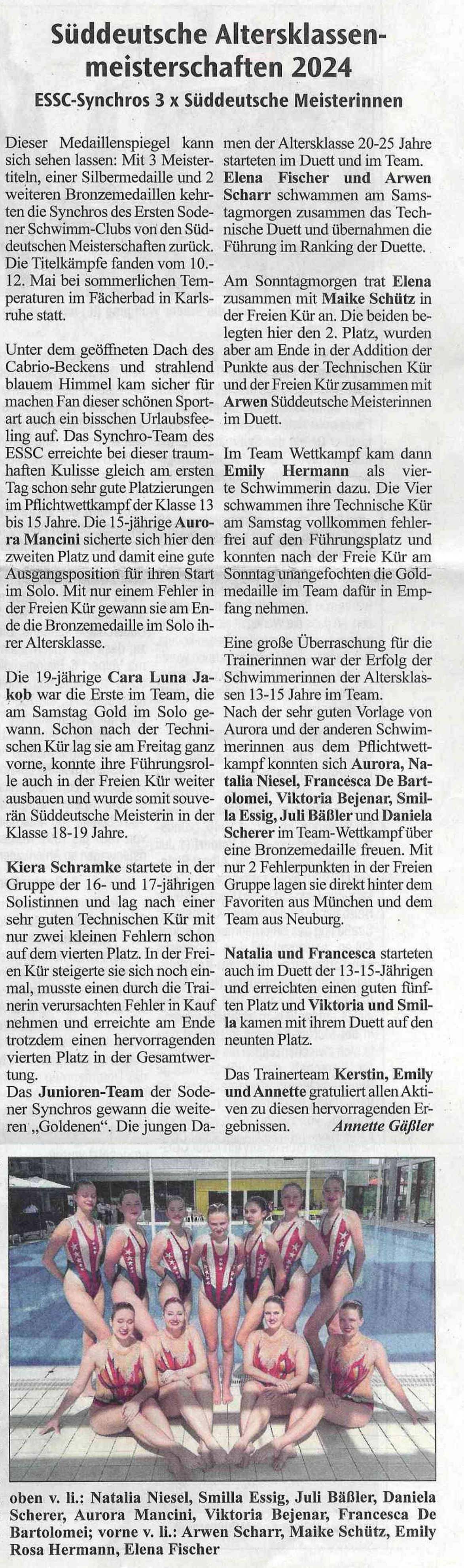 Mit 3 Meistertiteln, einer Silbermedaille und 2 weiteren Bronzemedaillen kehrten die Synchros des Ersten Sodener Schwimm-Clubs von den Süddeutschen Meisterschaften zurück. Die Titelkämpfe fanden