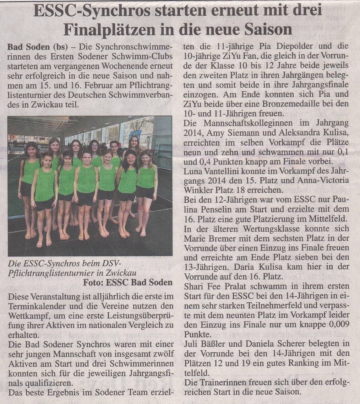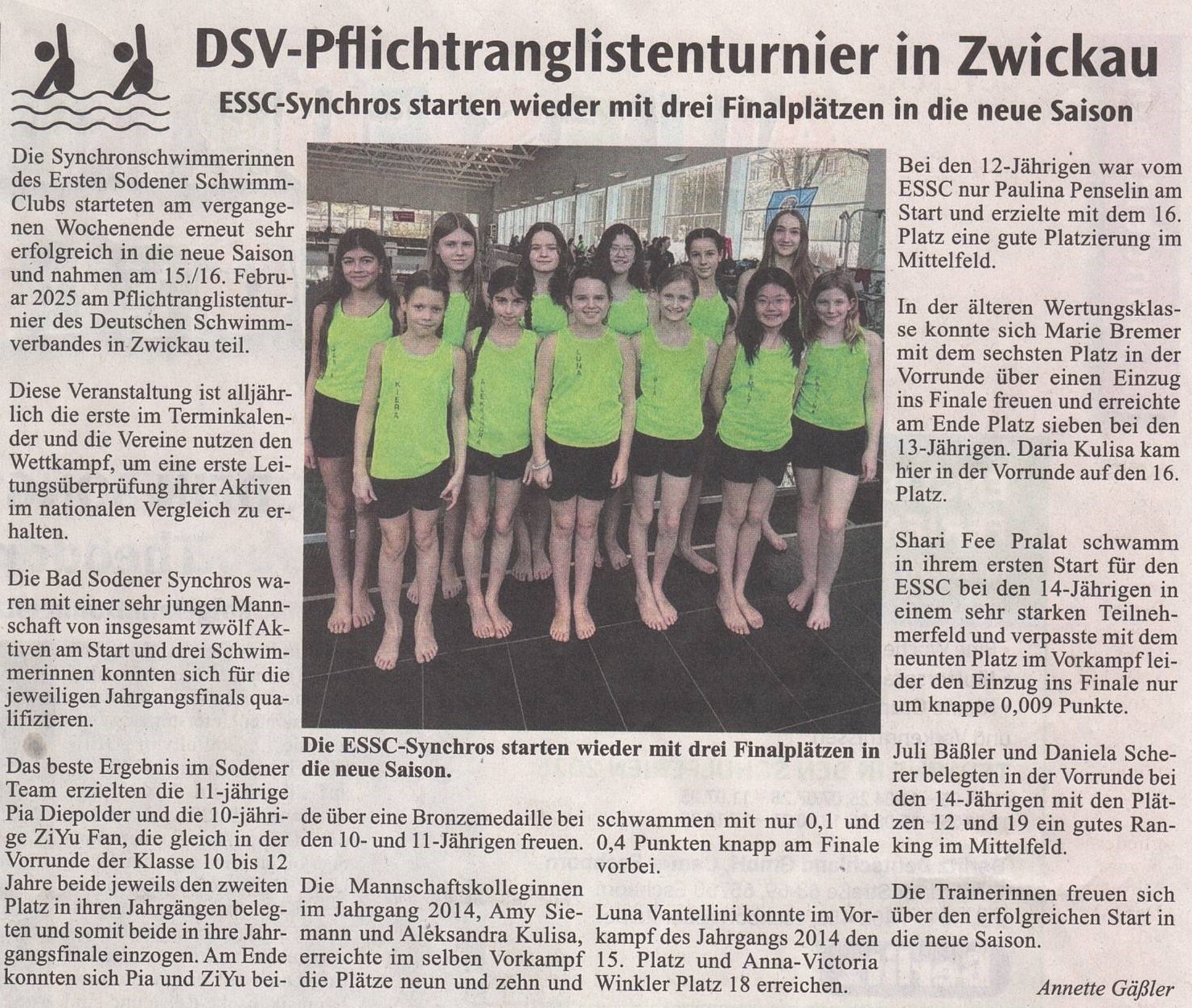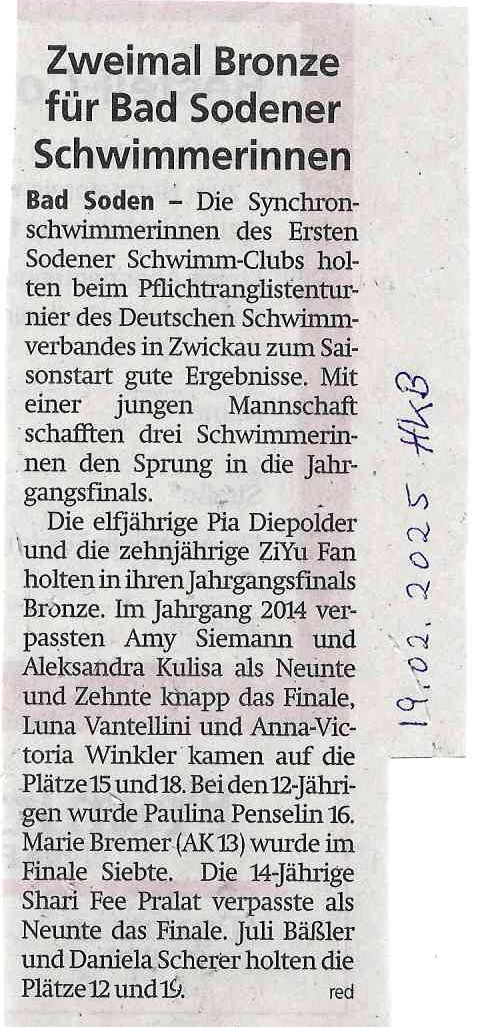 Die Synchronschwimmerinnen des Ersten Sodener Schwimm-Clubs starteten am vergangenen Wochenende erneut sehr erfolgreich in die neue Saison und nahmen am 15./16. Februar 2025 am Pflichtranglistenturnier des Deutschen Schwimmverbandes in Zwickau teil.