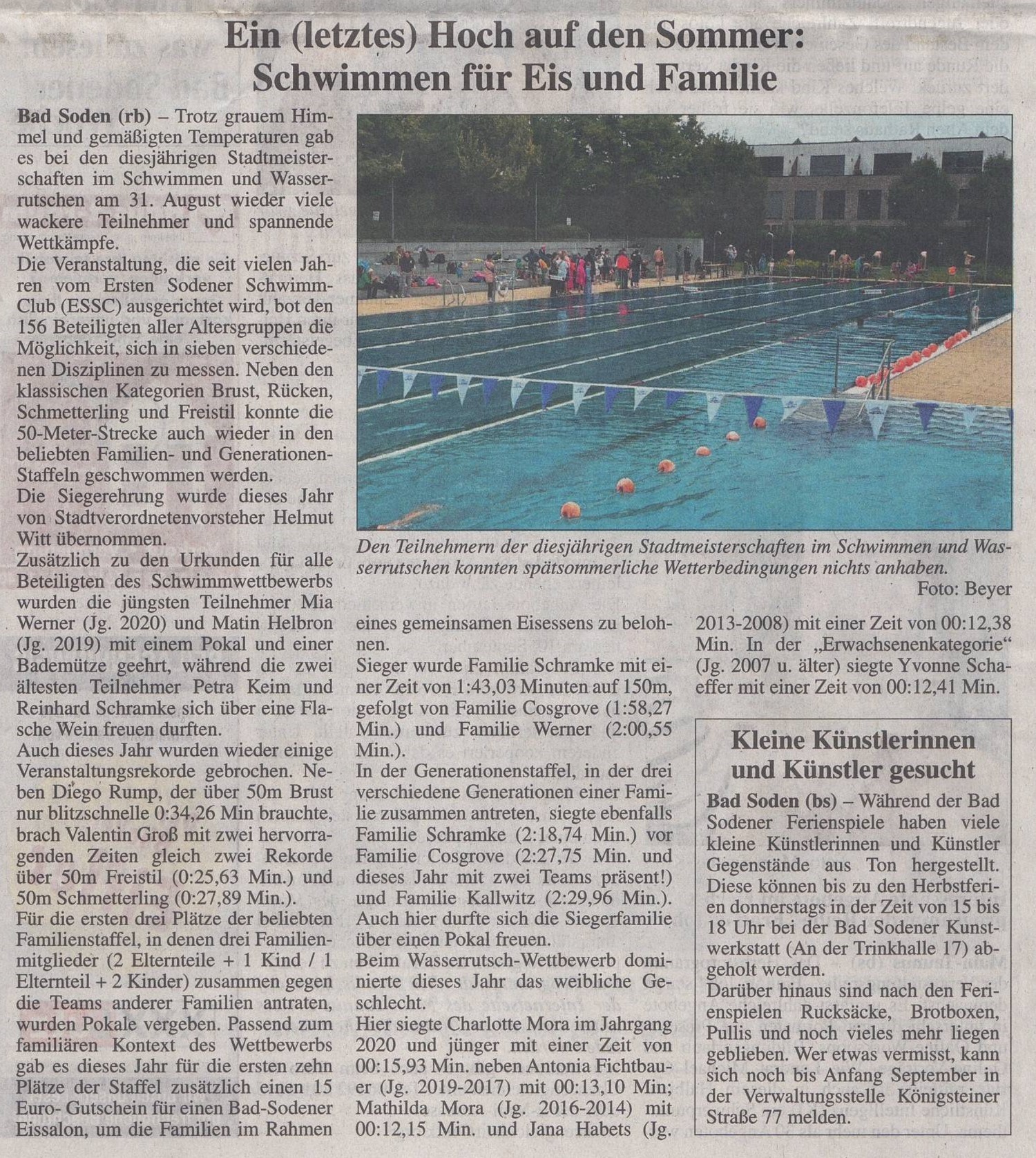 Die diesjährigen Stadtmeisterschaften im Schwimmen und Wasserrutschen richtete der ESSC am 31. August 2025 im FreiBadSoden aus. Bei warmen Temperaturen und Sonnenschein gab es viele spannende Wettbewerbe: