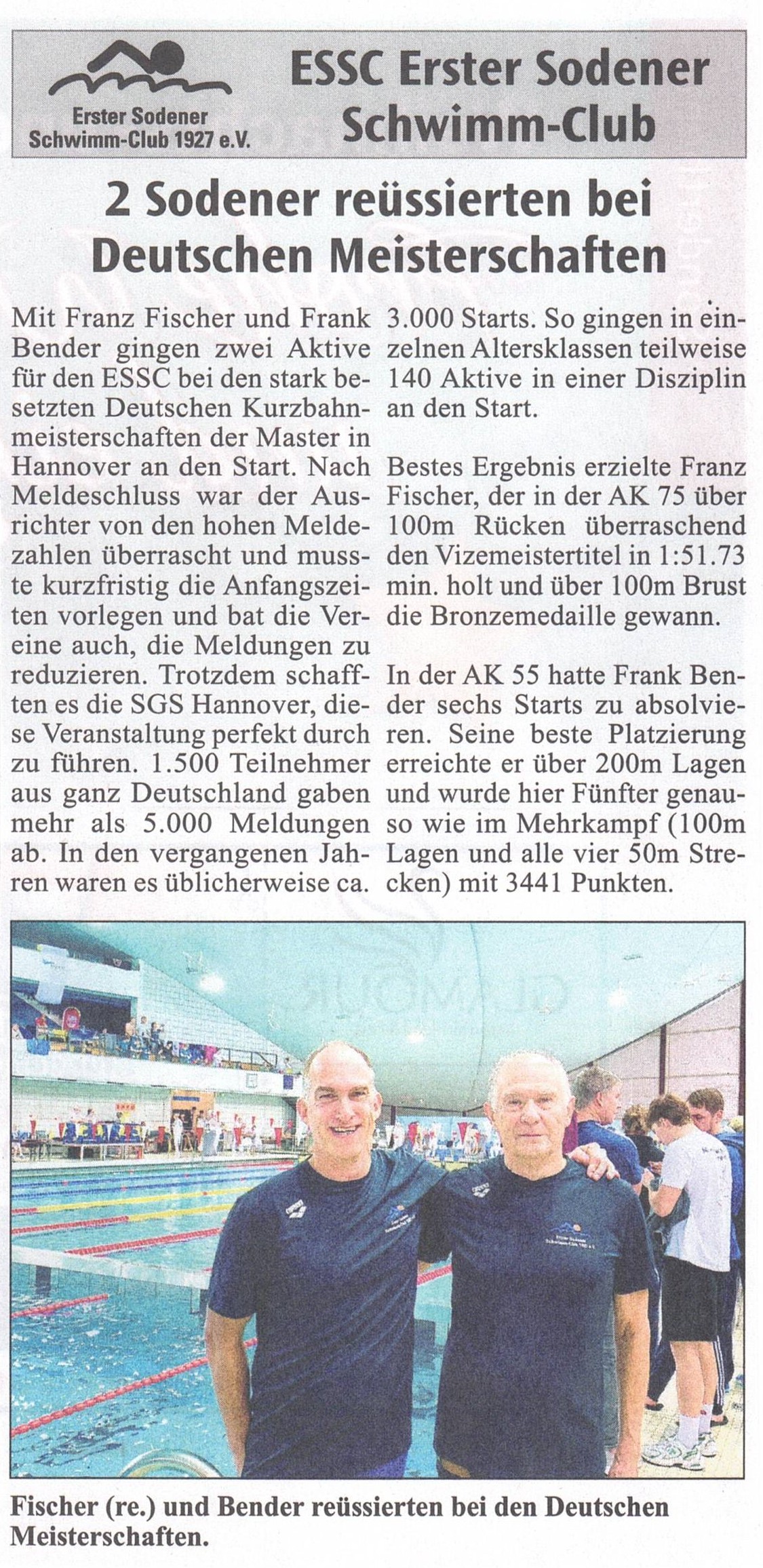 Mit Franz Fischer und Frank Bender gingen zwei Aktive für den ESSC bei den stark besetzten Deutschen Kurzbahnmeisterschaften der Master in Hannover an den Start. Nach Meldeschluss war der Ausrichter von den hohen Meldezahlen überrascht und musste kurzfristig die Anfangszeiten vorlegen und bat die Vereine auch, die Meldungen zu reduzieren. Trotzdem schafften es die SGS Hannover der Ausrichter, diese Veranstaltung perfekt durchzuführen. 1500 Teilnehmer aus ganz Deutschland gaben mehr als 5000 Meldungen ab. In den vergangenen Jahren sind es üblicherweise ca. 3000 Starts. So gingen in einzelnen Altersklassen teilweise 140 Aktive in einer Disziplin an den Start.