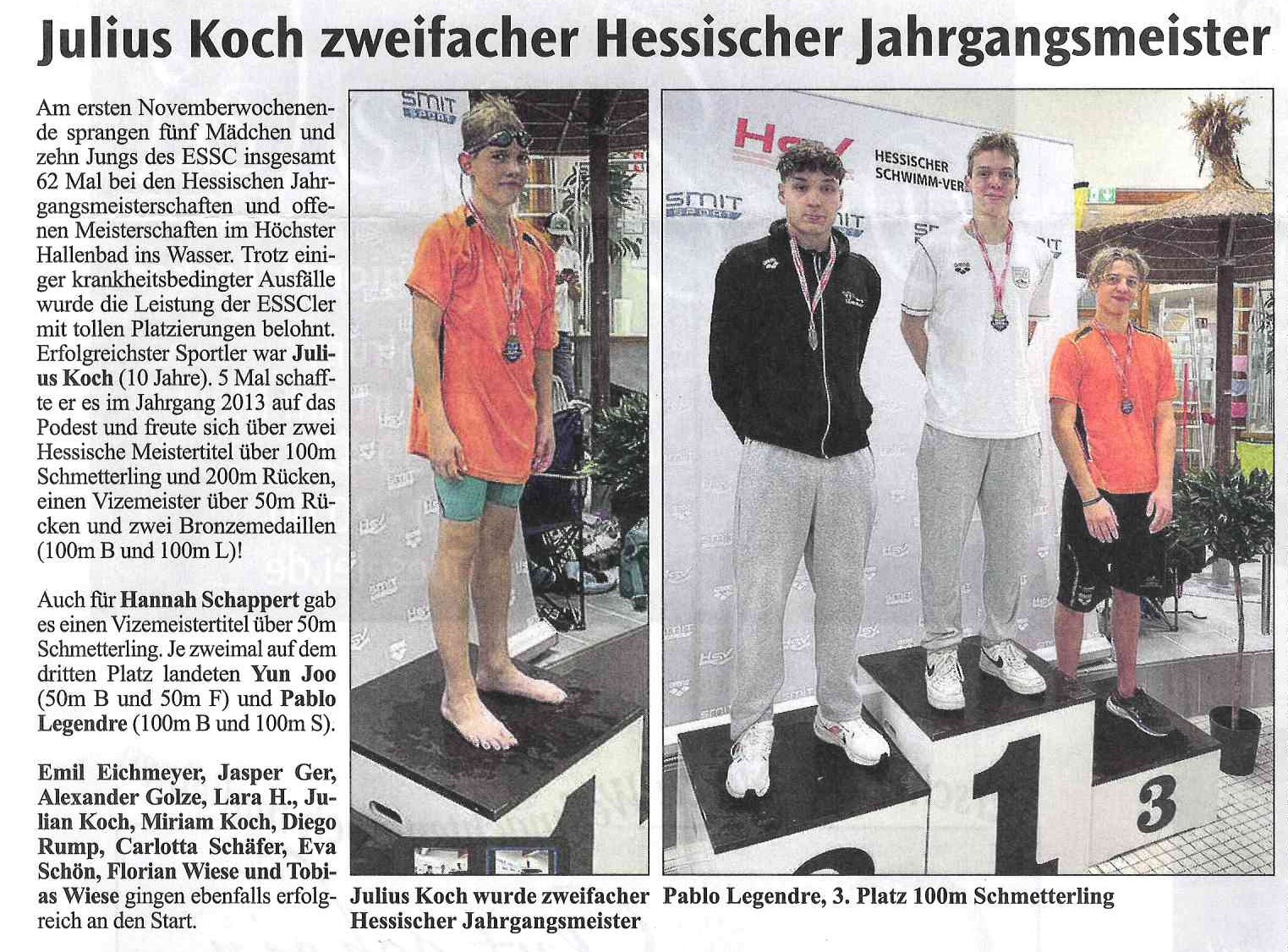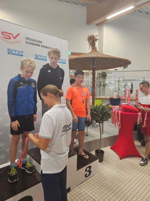 Erfolgreichster Sportler war Julius Koch. 5-mal schaffte er es im Jahrgang 2013 auf das Podest und freute sich über zwei Hessische Meistertitel über 100m Schmetterling und 200m Rücken, einen Vizemeister über 50m Rücken und zwei Bronzemedaillen (100m B und 100m L)! Auch für Hannah Schappert gab es einen Vizemeistertitel über 50m Schmetterling.