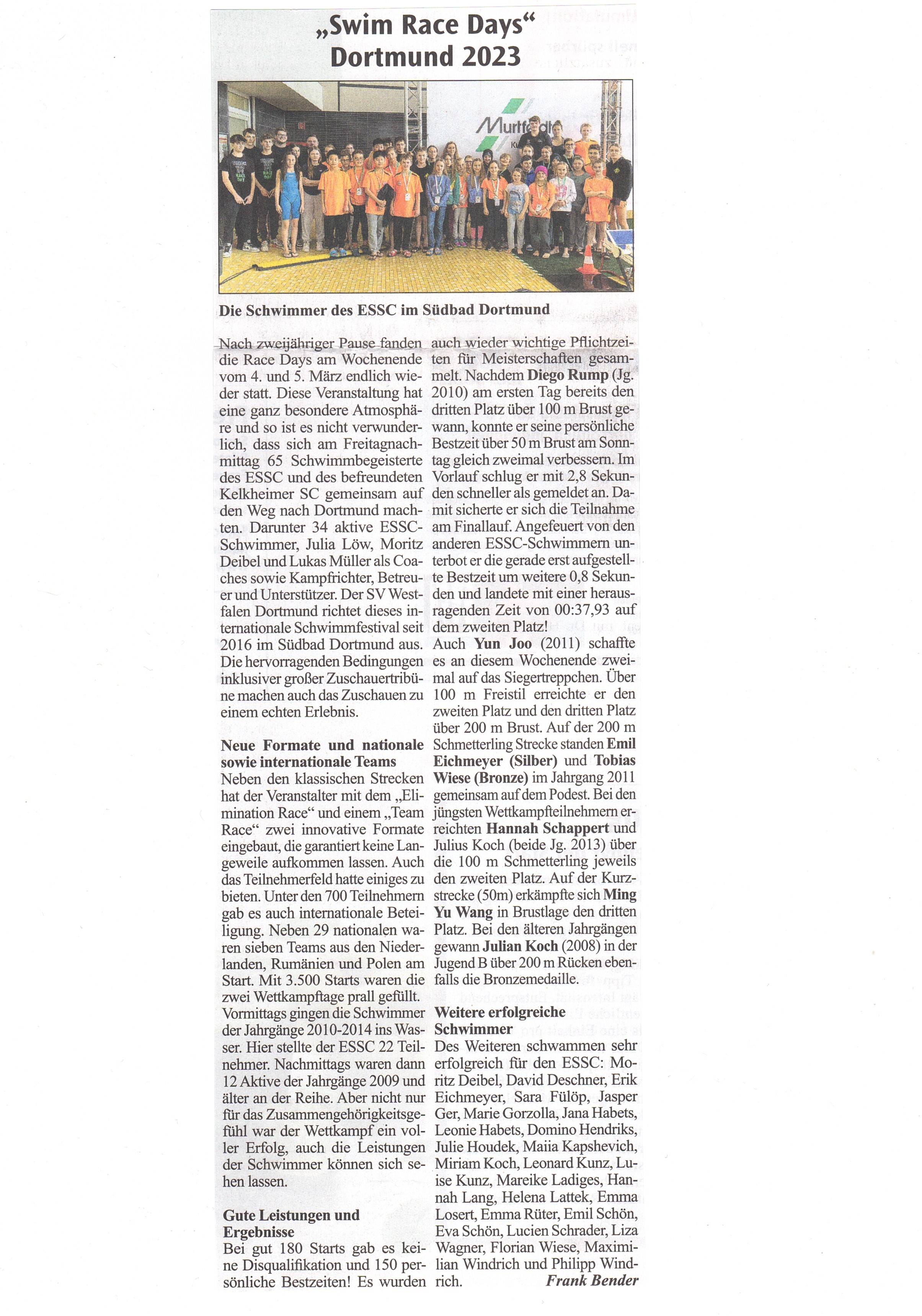 Nach zweijähriger Pause fanden die Race Days am Wochenende vom 4. und 5. März endlich wieder statt. Dieses Event hat eine ganz besondere Atmosphäre und so ist es nicht verwunderlich, dass sich am Freitagnachmittag 65 Schwimmbegeisterte des ESSC und des befreundeten Kelkheimer SC gemeinsam auf den Weg nach Dortmund machten. Darunter 34 aktive ESSC-Schwimmer*innen, 9 Starter*innen des KSCs, Julia Löw, Moritz Deibel und Lukas Müller als Coaches, sowie Kampfrichter*innen, Betreuer*innen und Unterstützer*innen.