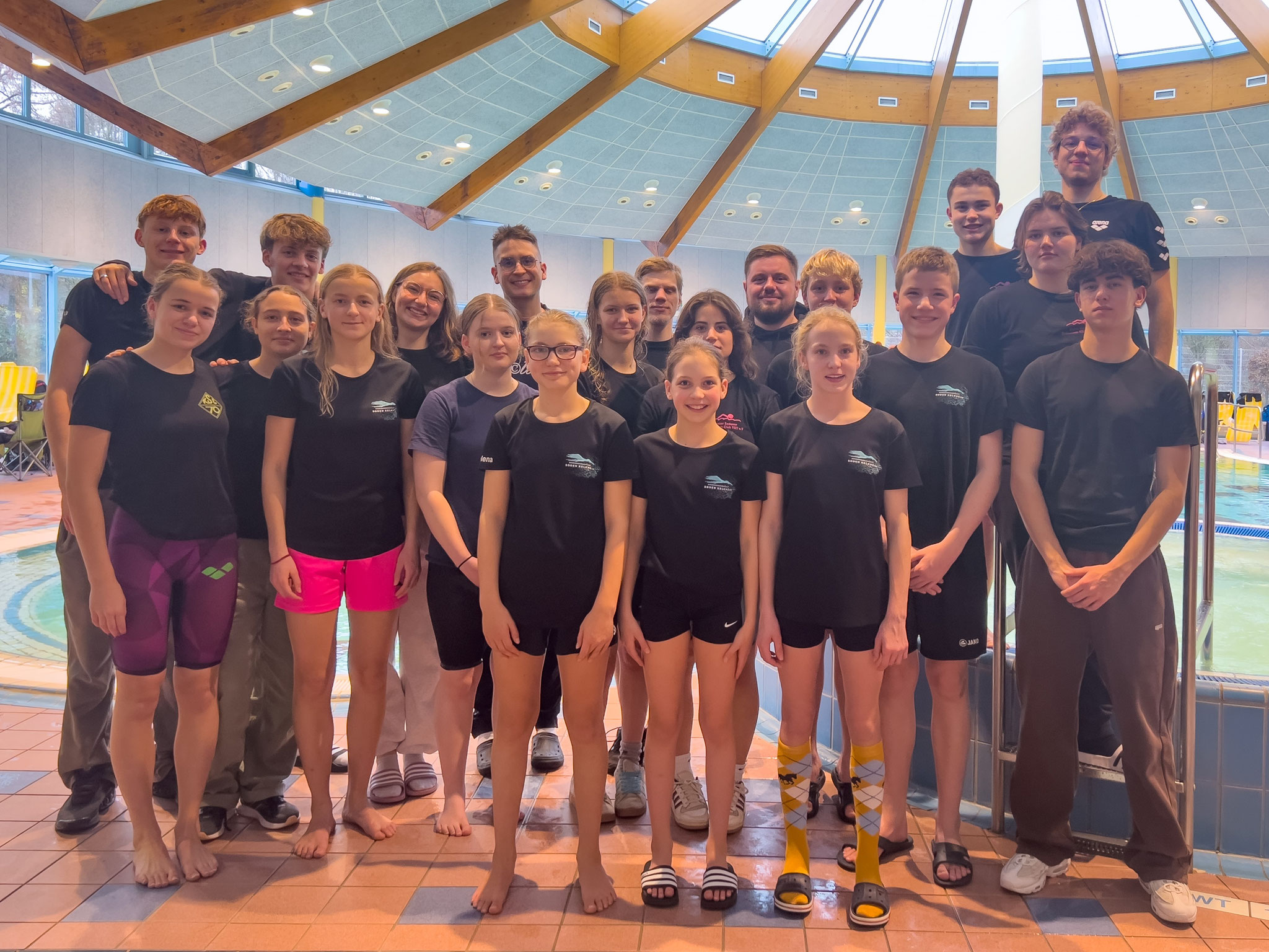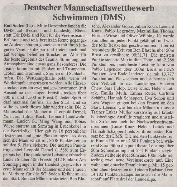 Am 3. Adventswochenende fanden die DMS auf Bezirks- und Landesliga-Ebene statt. Die DMS sind Kult für die Vereinsteams. Erfahrene und teils bereits in Rente gegangene Athleten starten gemeinsam mit ihren jüngeren Vereinskollegen und treten auch mal auf weniger beliebten Strecken an. Alles für das beste Ergebnis des Teams. Stimmung und Atmosphäre sind etwas ganz Besonderes. Die Teams kommen mit Pauken und Trompeten, Tröten und Trommeln, Sirenen und Schlachtrufen. Die Wettkampfhalle bebt, wenn 34 Wettkämpfe ausgetragen werden. Alle Einzelstrecken werden zweimal geschwommen (mit Ausnahme der langen Freistilstrecken über 800 m und 1.500 m Freistil).