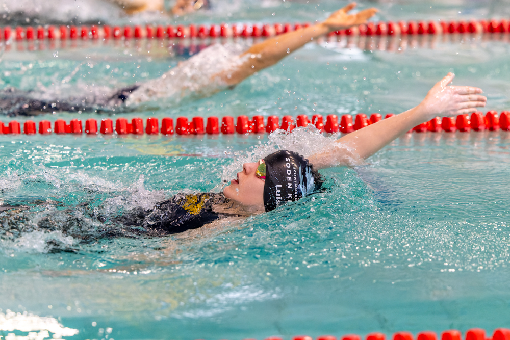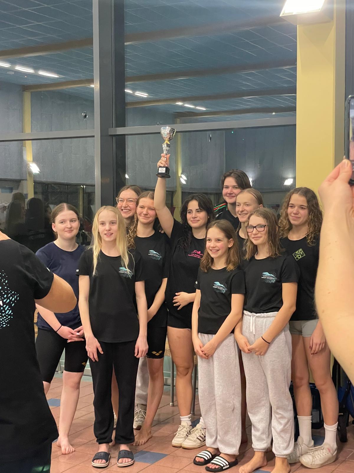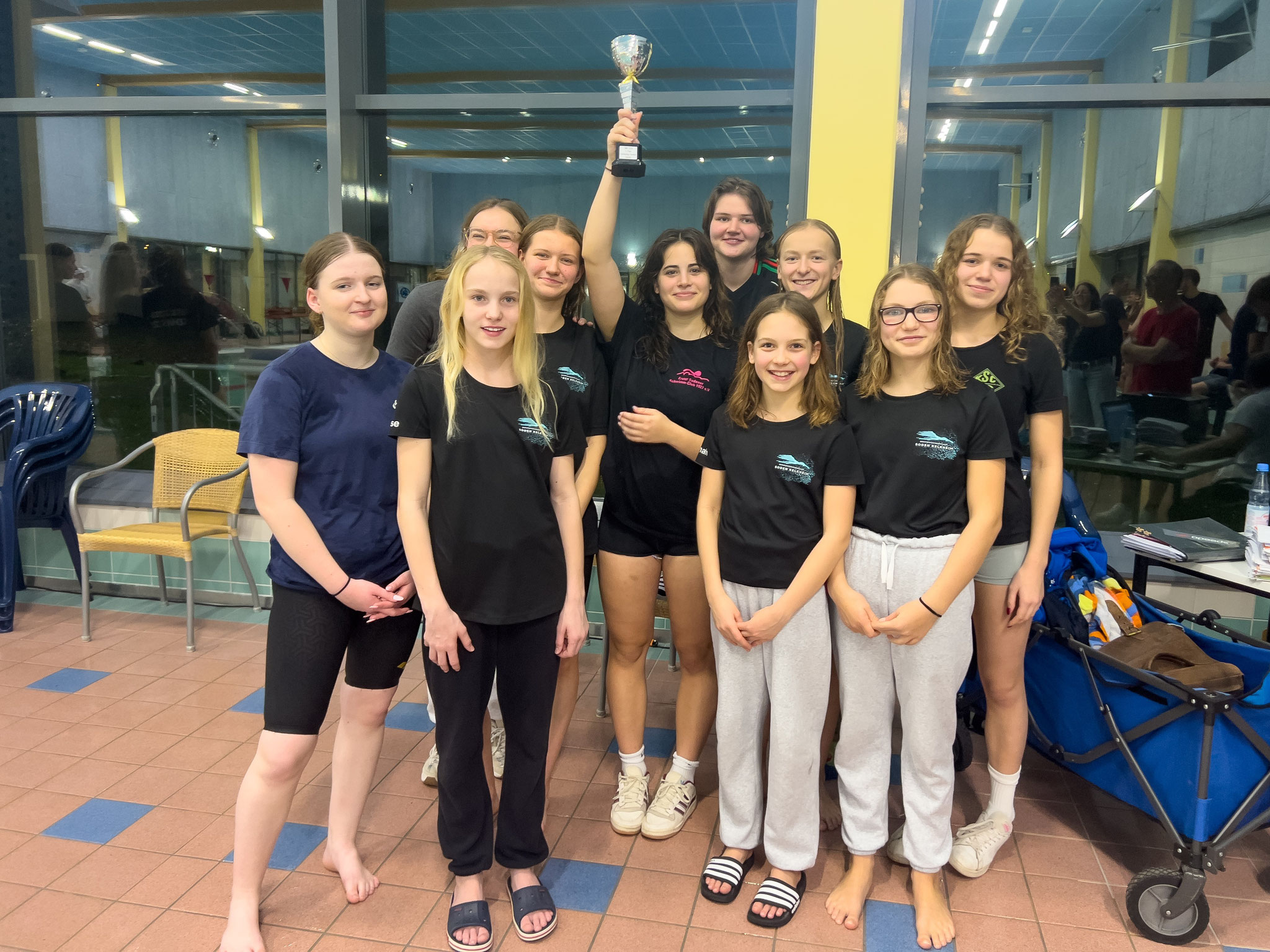 Victoria Chew, Sara Fülöp, Luise Kunz, Helena Lattek, Emilia Muth, Emma Rüter, Carlotta Schäfer, Hannah Schappert, Eva Schön und Liza Wagner gingen bei den Frauen an den Start. Ebenso wie bei den Männern musste Trainer Lukas Müller kurzfristig auf krankheitsbedingte Ausfälle reagieren und umstellen. So kamen auch drei Nachwuchsschwimmerinnen (Luise Kunz, Helena Lattek und Hannah Schappert) teils zu ihrem ersten Einsatz bei der DMS. Die meisten Punkte steuerte Emma Rüter mit 2.501 Punkten bei, während Sara Fülöp die punktbeste Leistung über 50m Schmetterling mit 534 Punkten zeigte. Zudem stellte sie über 50m und 100m Schmetterling zwei neue Vereinsrekorde auf. Eine wahnsinnig starke Teamleistung. Mit 15 persönlichen Bestzeiten und einem Endstand von 14.102 Punkten katapultierte sich die Mannschaft auf Platz drei der Landesliga und schaffte damit den Aufstieg in die Hessische Oberliga.