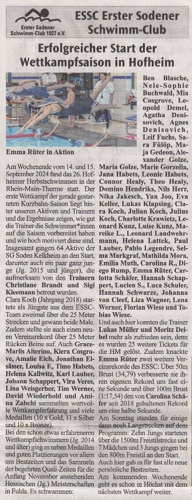 Am Wochenende vom 14. und 15. September 2024 fand das 26. Hofheimer Herbstschwimmen in der Rhein-Main-Therme statt. Der erste Wettkampf der gerade gestarteten Kurzbahn-Saison liegt hinter unseren Aktiven und Trainern und die Ergebnisse zeigen wie gut die Trainer die Schwimmer*innen auf die Saison vorbereitet haben und wie hoch motiviert diese sind.