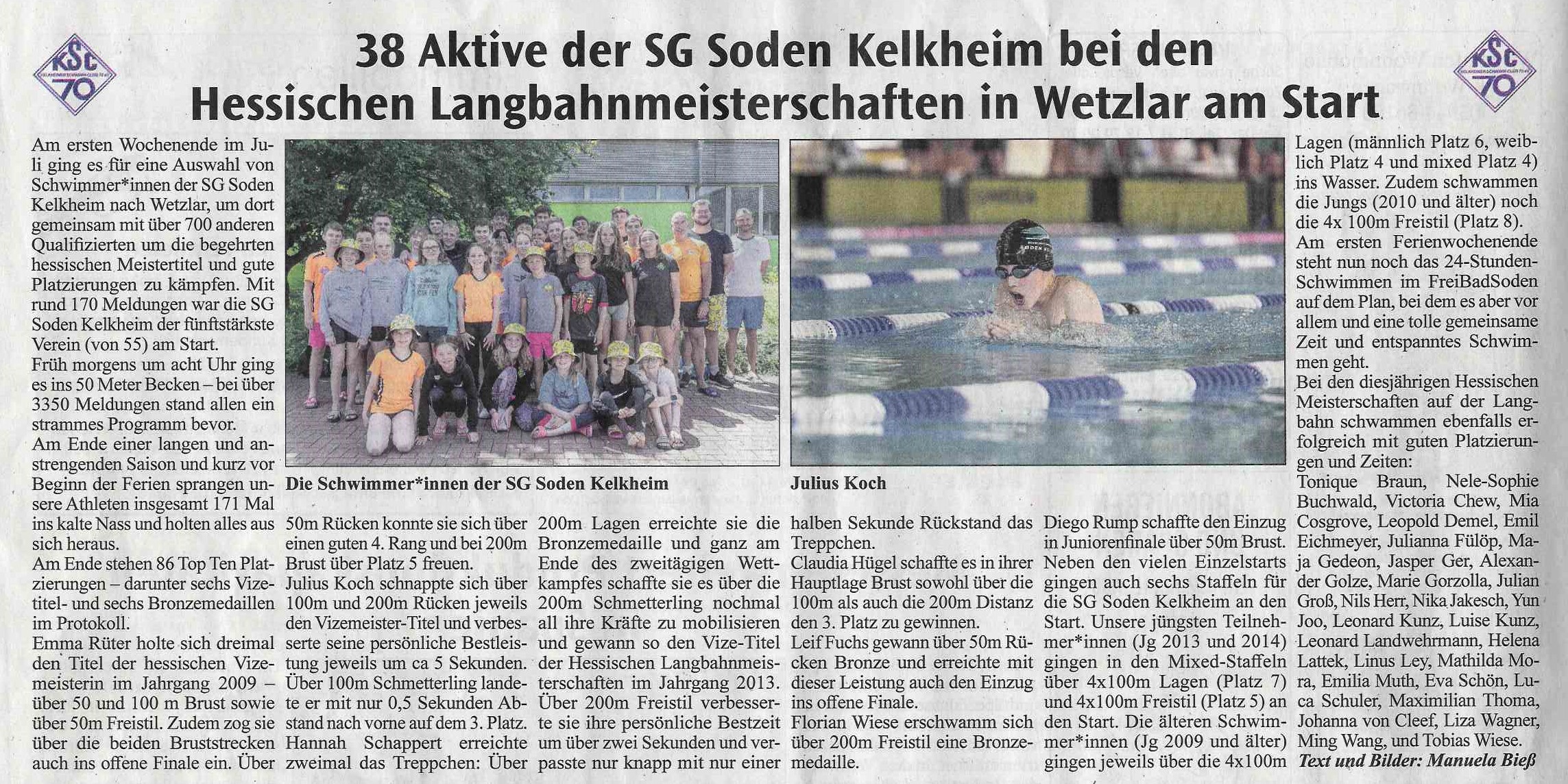 Am ersten Wochenende im Juli ging es für eine Auswahl von Schwimmerinnen und Schwimmer der SG Soden Kelkheim nach Wetzlar, um dort gemeinsam mit über 700 anderen Qualifizierten um die begehrten hessischen Meistertitel und gute Platzierungen zu kämpfen. Mit rund 170 Meldungen war die SG Soden Kelkheim der fünftstärkste Verein (von 55) am Start.