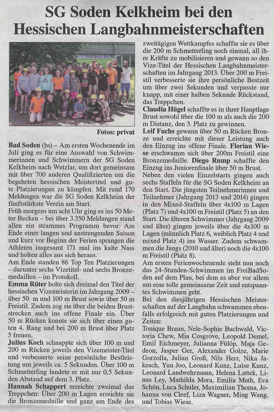 Bei den diesjährigen Hessischen Meisterschaften auf der Langbahn schwammen ebenfalls erfolgreich mit guten Platzierungen und Zeiten: Tonique Braun, Nele-Sophie Buchwald, Victoria Chew, Mia Cosgrove, Leopold Demel, Emil Eichmeyer, Julianna Fülöp, Maja Gedeon, Jasper Ger, Alexander Golze, Marie Gorzolla, Julian Groß, Nils Herr, Nika Jakesch, Yun Joo, Leonard Kunz, Luise Kunz, Leonard Landwehrmann, Helena Lattek, Linus Ley, Mathilda Mora, Emilia Muth, Eva Schön, Luca Schuler, Maximilian Thoma, Johanna von Cleef, Liza Wagner, Ming Wang, und Tobias Wiese.