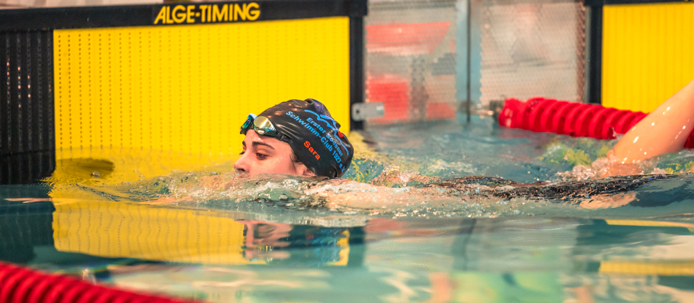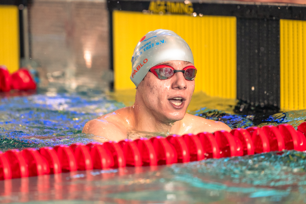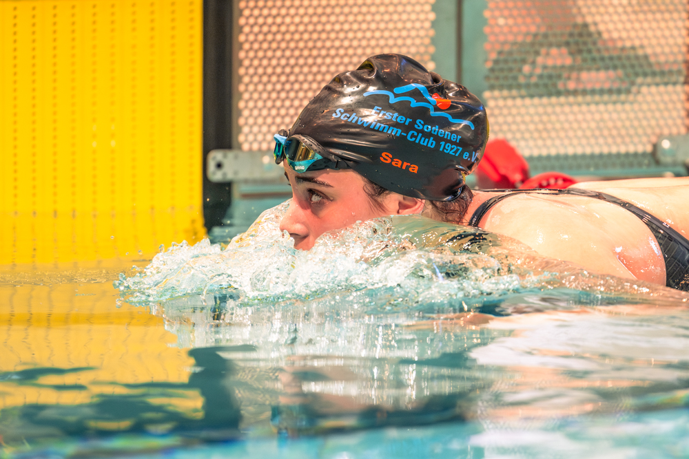 Den Anfang machte wieder Sara, die über ihre Paradelage Rücken gerne nochmal ihre Form über die 100m unter Beweis stellen wollte. Mit einer 1:11,33 gelang ihr zwar keine persönliche Bestzeit, aber mit einem Saisonrekord holte sie sich den dritten Platz. Auch Emma wollte über 100m Brust nochmal zeigen was sie kann. Sie verbesserte ihre gerade erst in Darmstadt aufgestellte Bestzeit um eine dreiviertel Sekunde, belegte damit Platz 9 und hat sich die DJM-Teilnahme erschwommen. Pablo bestätigte auf der dieser Strecke seine bisherige Leistung und kam auf Platz 8.
