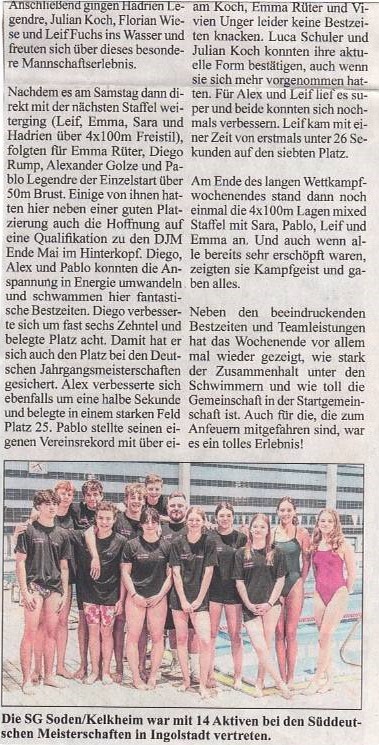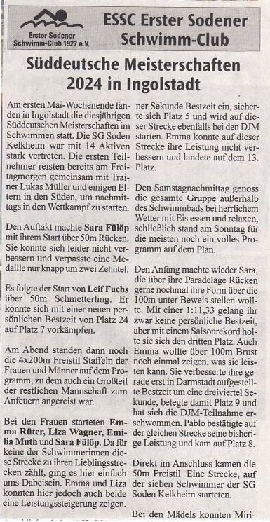 Am ersten Mai-Wochenende fanden in Ingolstadt die diesjährigen Süddeutschen Meisterschaften im Schwimmen statt. Die SG Soden Kelkheim war mit 14 Aktiven stark vertreten. Die ersten Teilnehmer*innen reisten bereits am Freitagmorgen gemeinsam mit Trainer Lukas Müller und einigen Eltern in den Süden, um nachmittags in den Wettkampf zu starten.