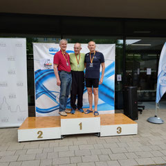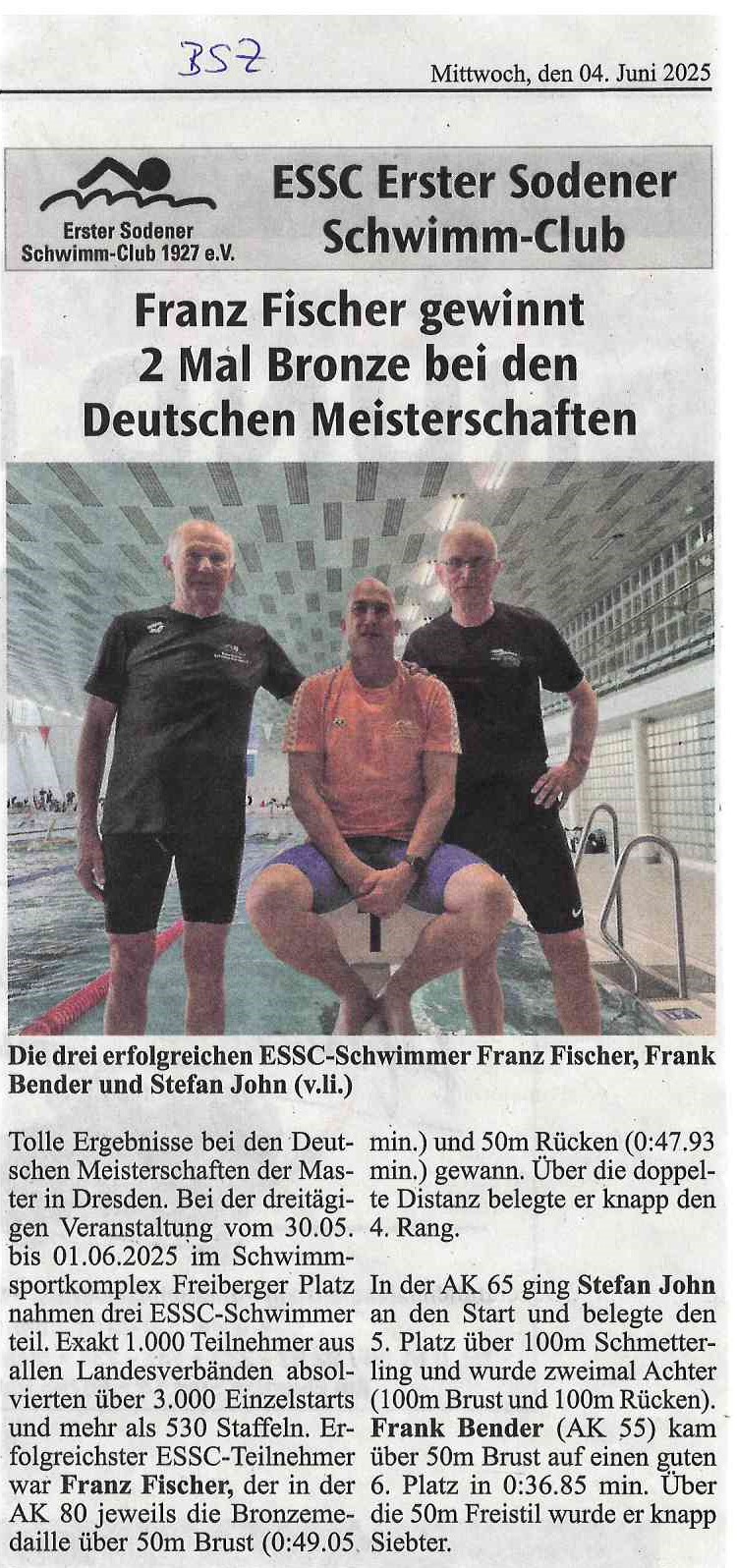 Tolle Ergebnisse bei den Deutschen Meisterschaften der Master in Dresden. Bei der 3-tägigen Veranstaltung vom 30.05. bis 01.06.2025 im Schwimmsportkomplex Freiberger Platz nahmen drei ESSC-Schwimmer teil. Exakt 1000 Teilnehmer aus allen Landesverbänden absolvierten über 3000 Einzelstarts und mehr als 530 Staffeln. Erfolgreichster ESSC-Teilnehmer war Franz Fischer, der in der AK 80 jeweils die Bronzemedaille über 50m Brust (0:49.05 min.) und 50m Rücken (0:47.93 min.) gewann. Über die doppelte Distanz belegte er knapp den 4. Rang. In der AK 65 ging Stefan John an den Start und belegte den 5. Platz über 100m Schmetterling und wurde zweimal Achter (100m Brust und 100m Rücken). Frank Bender (AK 55) kam über 50m Brust auf einen guten 6. Platz in 0:36.85 min. Über die 50m Freistil wurde er knapp Siebter.