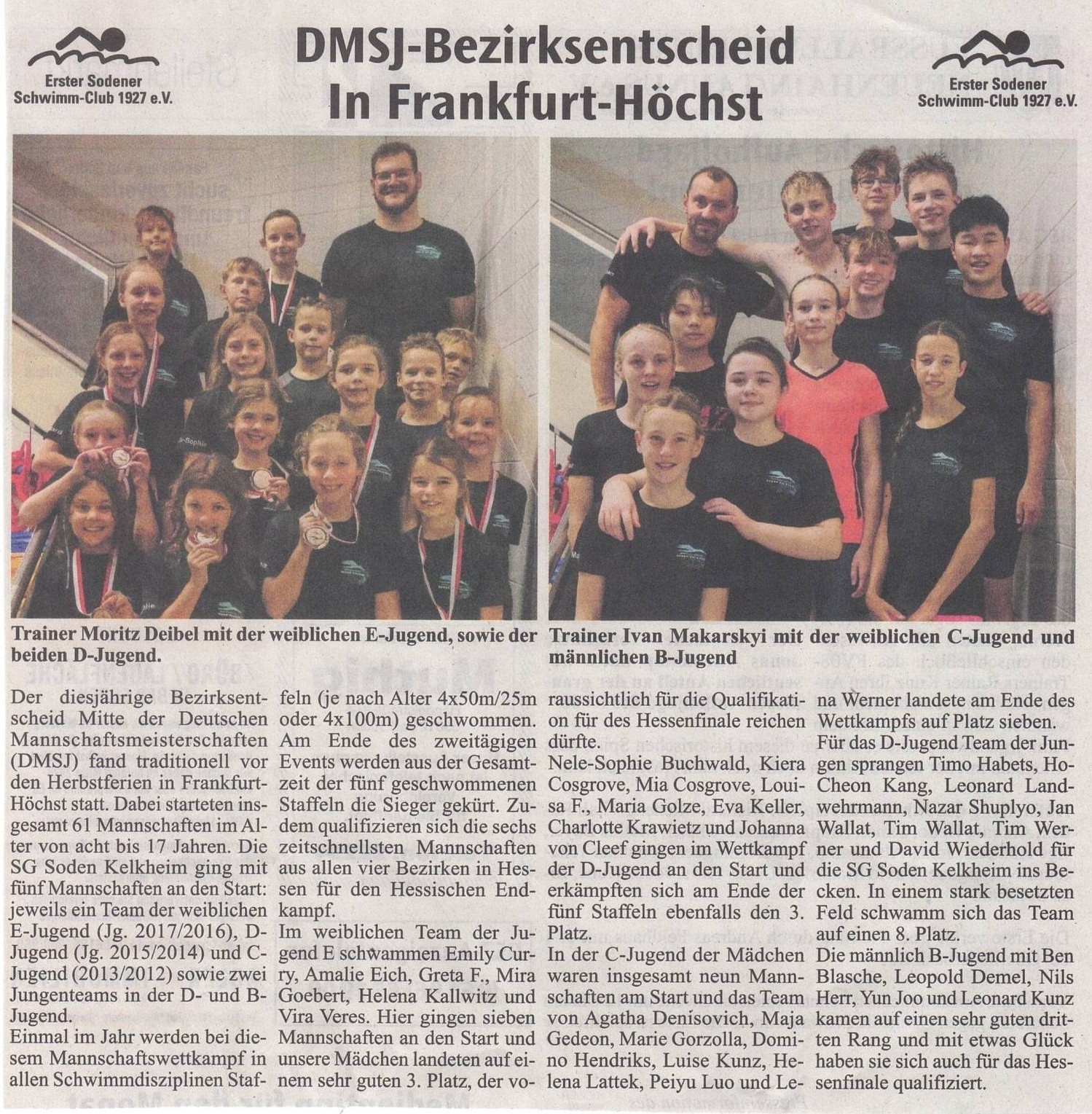 Der diesjährige Bezirksentscheid Mitte der Deutschen Mannschaftsmeisterschaften (DMSJ) fand traditionell vor den Herbstferien in Frankfurt-Höchst statt. Dabei starteten insgesamt 61 Mannschaften im Alter von acht bis 17 Jahren. Die SG Soden Kelkheim ging mit fünf Mannschaften an den Start: jeweils ein Team der weiblichen E-Jugend (Jg. 2017/2016), D-Jugend (Jg. 2015/2014) und C-Jugend (2013/2012) sowie zwei Jungenteams in der D- und B-Jugend.