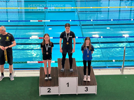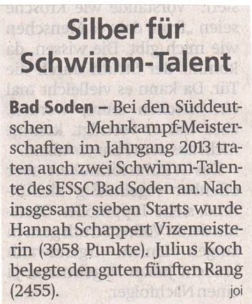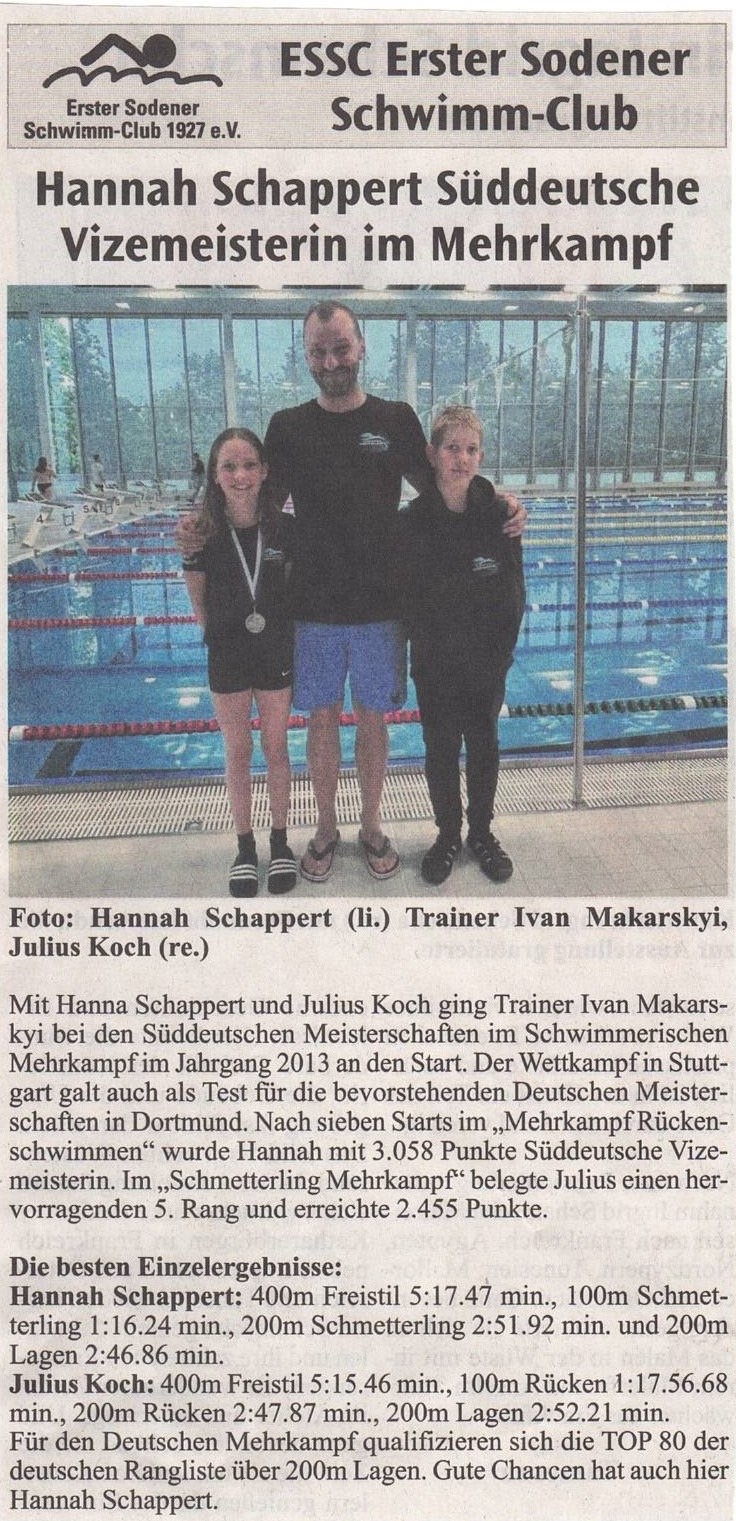 Nach sieben Starts im "Mehrkampf Rücken-schwimmen" wurde Hannah mit 3058 Punkte Süddeutsche Vizemeisterin. Im "Schmetterling Mehrkampf" belegte Julius einen hervorragenden 5. Rang und erreichte 2455 Punkte.