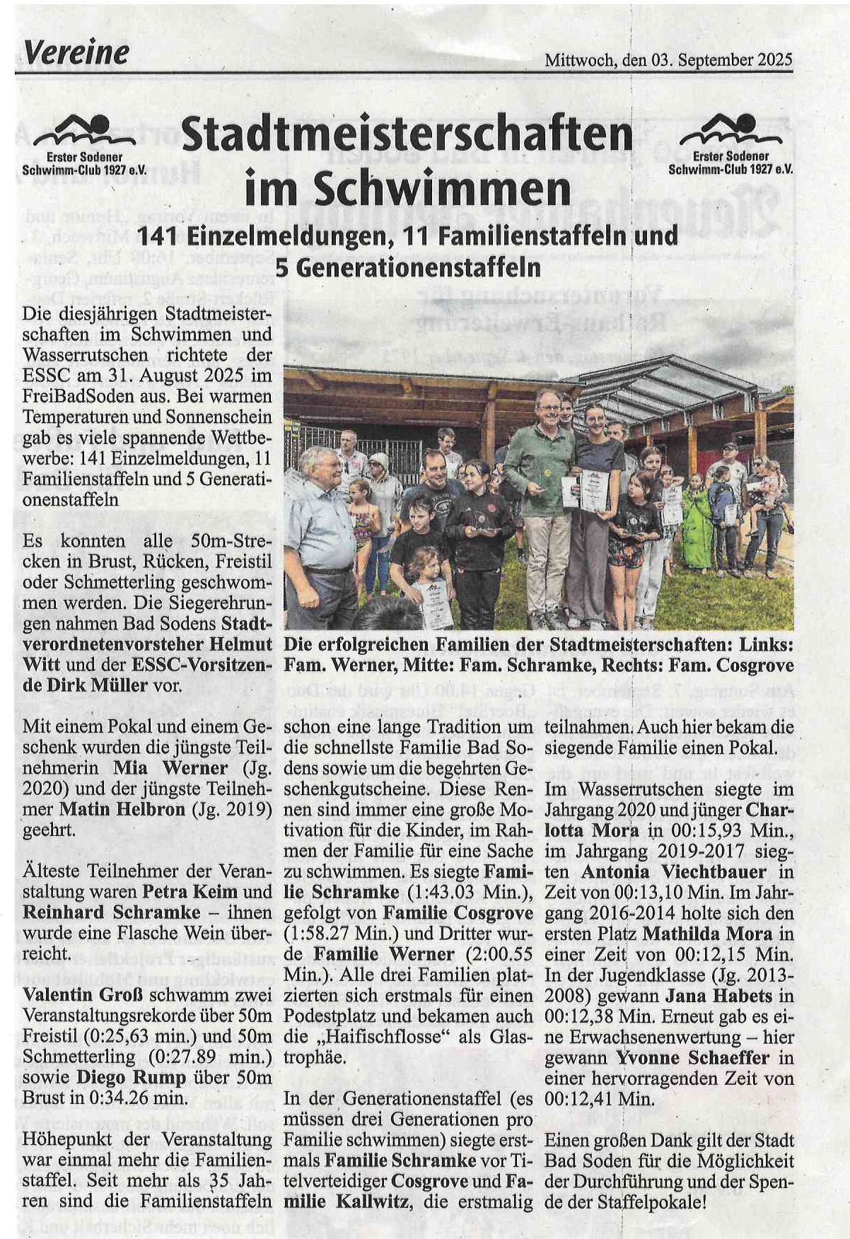 Die diesjährigen Stadtmeisterschaften im Schwimmen und Wasserrutschen richtete der ESSC am 31. August 2025 im FreiBadSoden aus. Bei warmen Temperaturen und Sonnenschein gab es viele spannende Wettbewerbe: